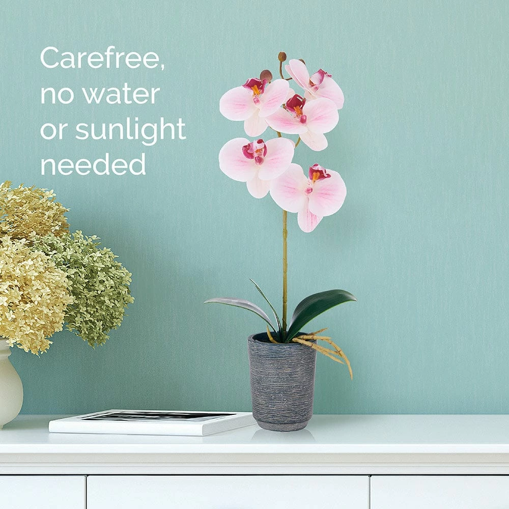 This Orchid Artificial Greenery by Mikasa is a charming display piece that features lifelike orchids in a decorative pot. Made from high-quality plastic materials, these flowers will amaze your guests with their lifelike touch and feel. Artificial florals are the perfect, low-maintenance solution to bringing the beauty of fresh flowers into your home — no sunlight or watering required. Realistic faux flowers create a relaxing, welcoming atmosphere and brighten any office, bedroom, bathroom, kitchen, balcony, living room, apartment, café, or classroom. These elegant decorations also make a great gift. Stems feature a hidden wire for bending orchids into a unique shape. FLOWER & POT SIZE: Flower measures 6.3×4.72×16.14; pot measures 3×3.75 inches.