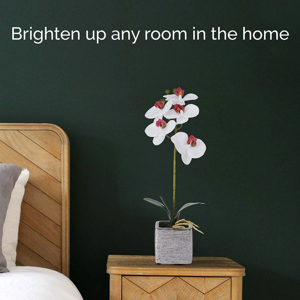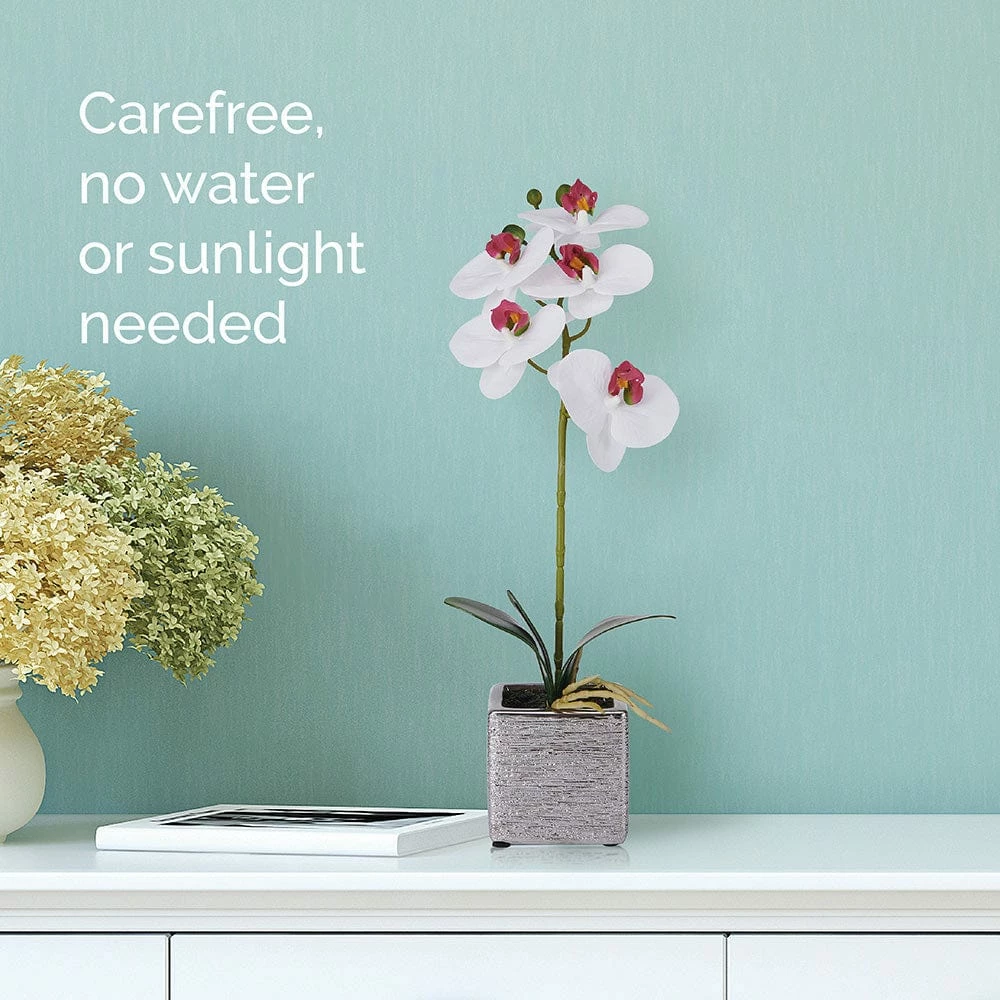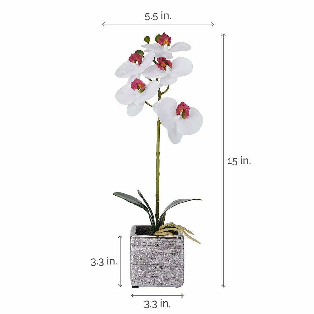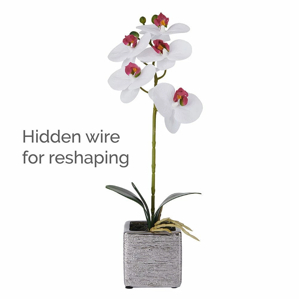 This Orchid Artificial Greenery by Mikasa is a charming display piece that features lifelike orchids in a decorative pot. Made from high-quality plastic materials, these flowers will amaze your guests with their lifelike touch and feel. Artificial florals are the perfect, low-maintenance solution to bringing the beauty of fresh flowers into your home — no sunlight or watering required. Realistic faux flowers create a relaxing, welcoming atmosphere and brighten any office, bedroom, bathroom, kitchen, balcony, living room, apartment, café, or classroom. These elegant decorations also make a great gift. Stems feature a hidden wire for bending orchids into a unique shape. FLOWER & POT SIZE: Flower measures 5.51×4.72×14.96; pot measures 3.25×3.25 inches.