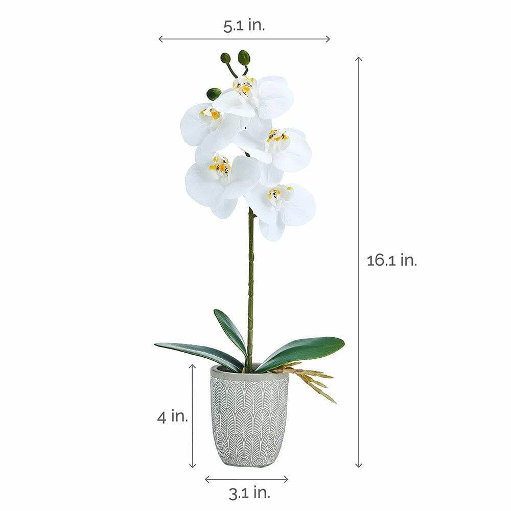 This Orchid Artificial Greenery by Mikasa is a charming display piece that features lifelike orchids in a decorative pot. Made from high-quality plastic materials, these flowers will amaze your guests with their lifelike touch and feel. Artificial florals are the perfect, low-maintenance solution to bringing the beauty of fresh flowers into your home — no sunlight or watering required. Realistic faux flowers create a relaxing, welcoming atmosphere and brighten any office, bedroom, bathroom, kitchen, balcony, living room, apartment, café, or classroom. These elegant decorations also make a great gift. Stems feature a hidden wire for bending orchids into a unique shape. FLOWER & POT SIZE: Flower measures 5.12×3.54×16.14; pot measures 3.125×4 inches.