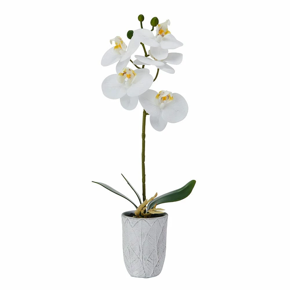 This Orchid Artificial Greenery by Mikasa is a charming display piece that features lifelike orchids in a decorative pot. Made from high-quality plastic materials, these flowers will amaze your guests with their lifelike touch and feel. Artificial florals are the perfect, low-maintenance solution to bringing the beauty of fresh flowers into your home — no sunlight or watering required. Realistic faux flowers create a relaxing, welcoming atmosphere and brighten any office, bedroom, bathroom, kitchen, balcony, living room, apartment, café, or classroom. These elegant decorations also make a great gift. Stems feature a hidden wire for bending orchids into a unique shape. FLOWER & POT SIZE: Flower measures 5.51×2.76×16.34; pot measures 3×3.75 inches.