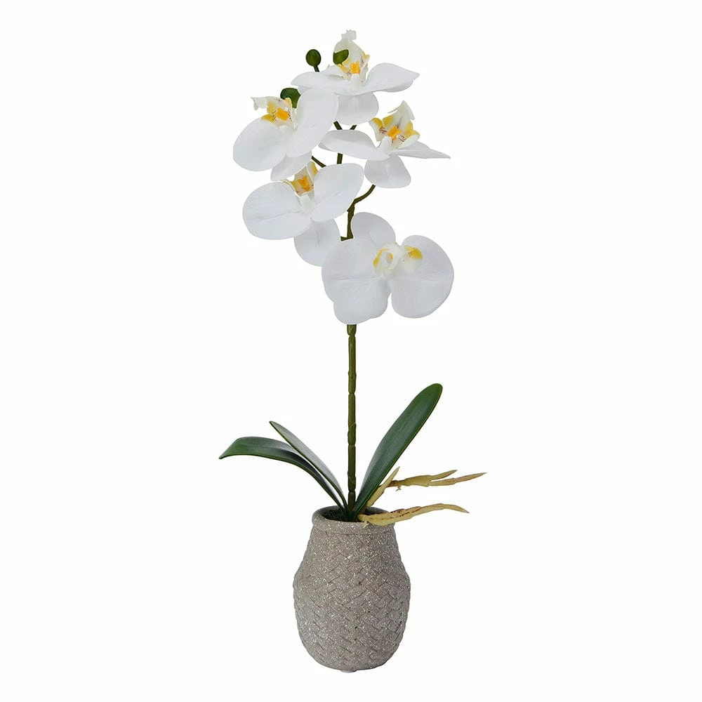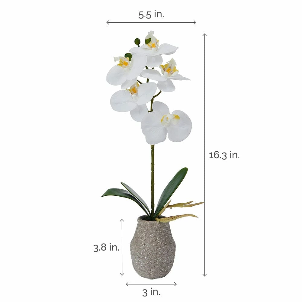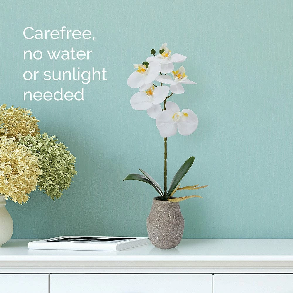 This Orchid Artificial Greenery by Mikasa is a charming display piece that features lifelike orchids in a decorative pot. Made from high-quality plastic materials, these flowers will amaze your guests with their lifelike touch and feel. Artificial florals are the perfect, low-maintenance solution to bringing the beauty of fresh flowers into your home — no sunlight or watering required. Realistic faux flowers create a relaxing, welcoming atmosphere and brighten any office, bedroom, bathroom, kitchen, balcony, living room, apartment, café, or classroom. These elegant decorations also make a great gift. Stems feature a hidden wire for bending orchids into a unique shape. FLOWER & POT SIZE: Flower measures 5.51×2.76×16.34; pot measures 3×3.75 inches.