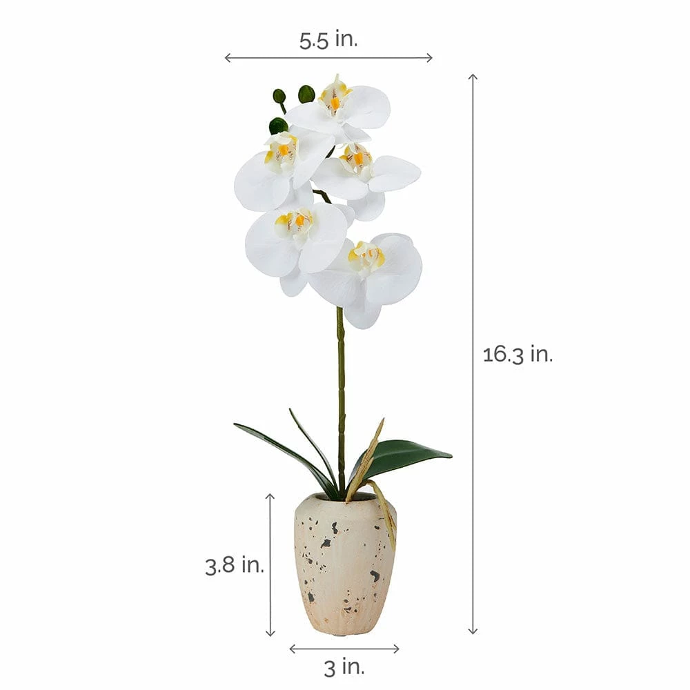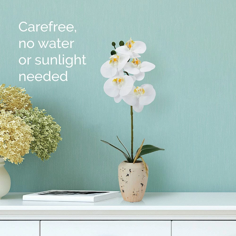 This Orchid Artificial Greenery by Mikasa is a charming display piece that features lifelike orchids in a decorative pot. Made from high-quality plastic materials, these flowers will amaze your guests with their lifelike touch and feel. Artificial florals are the perfect, low-maintenance solution to bringing the beauty of fresh flowers into your home — no sunlight or watering required. Realistic faux flowers create a relaxing, welcoming atmosphere and brighten any office, bedroom, bathroom, kitchen, balcony, living room, apartment, café, or classroom. These elegant decorations also make a great gift. Stems feature a hidden wire for bending orchids into a unique shape. FLOWER & POT SIZE: Flower measures 5.51×2.76×16.34; pot measures 3×3.75 inches.