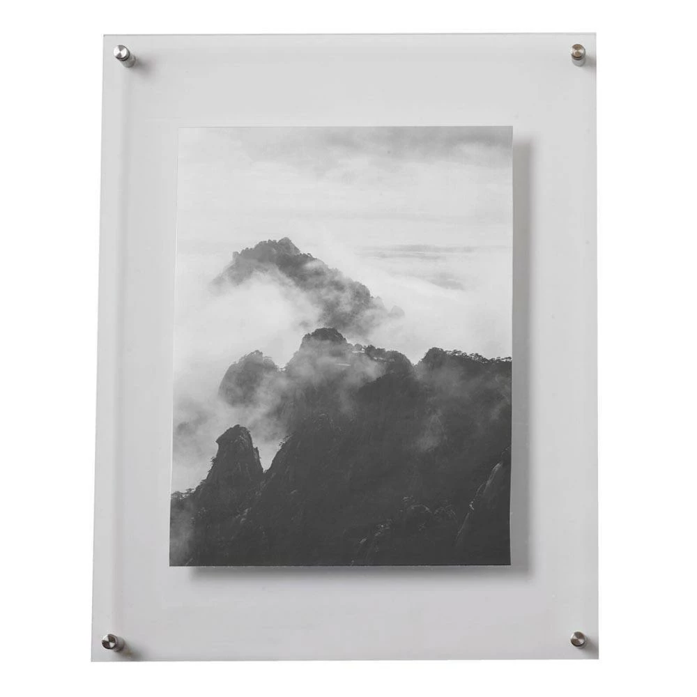 This Mikasa Clear Acrylic Floating Wall Frame will display your favorite 11 x 14 inch photo. Crafted of acrylic with silver hardware accents, this contemporary clear frame gives the illusion that your photo is floating and complements any décor, allowing the color of your wall to serve as a backdrop. Simply peel the protective film from both sides of the acrylic sheets to reveal the crystal clear finish. Frame measures 16 x 20 inches, and holds (1) 11 x 14 inch photo
