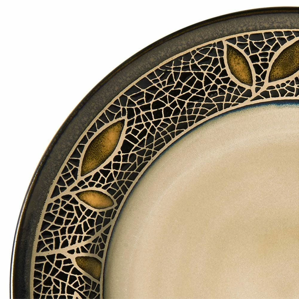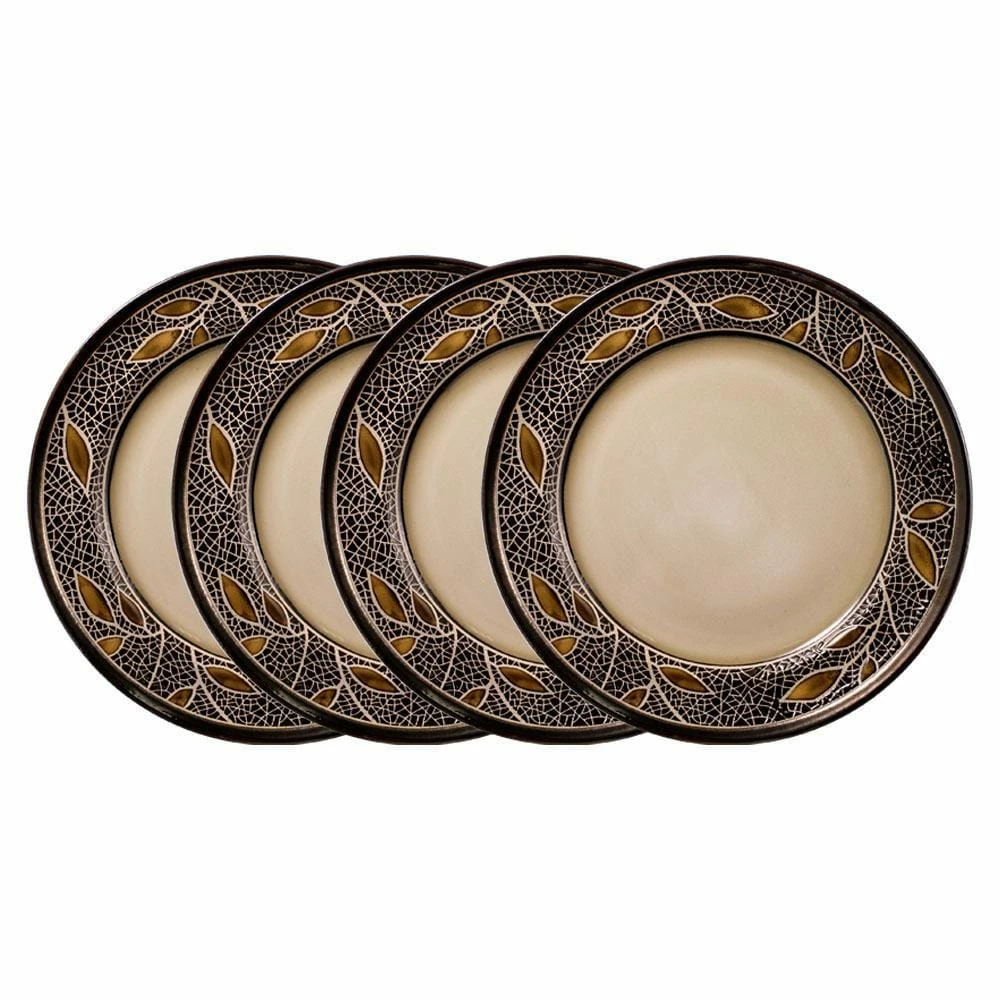This Mikasa Alexandria Set of 4 Dinner Plates feature warm, tranquil earth tones of bold espresso and soothing beige, and a striking rim design adorned with sprigs of golden brown leaves and highlighted by a crackle effect, with a reactive glaze finish. Due to the nature and hand-crafted qualities of reactive glaze, no two pieces are exactly alike and will exhibit unique variations in color and pattern. Product may slightly differ from image shown.