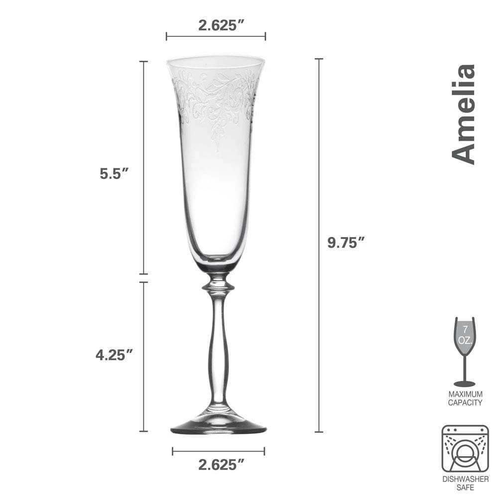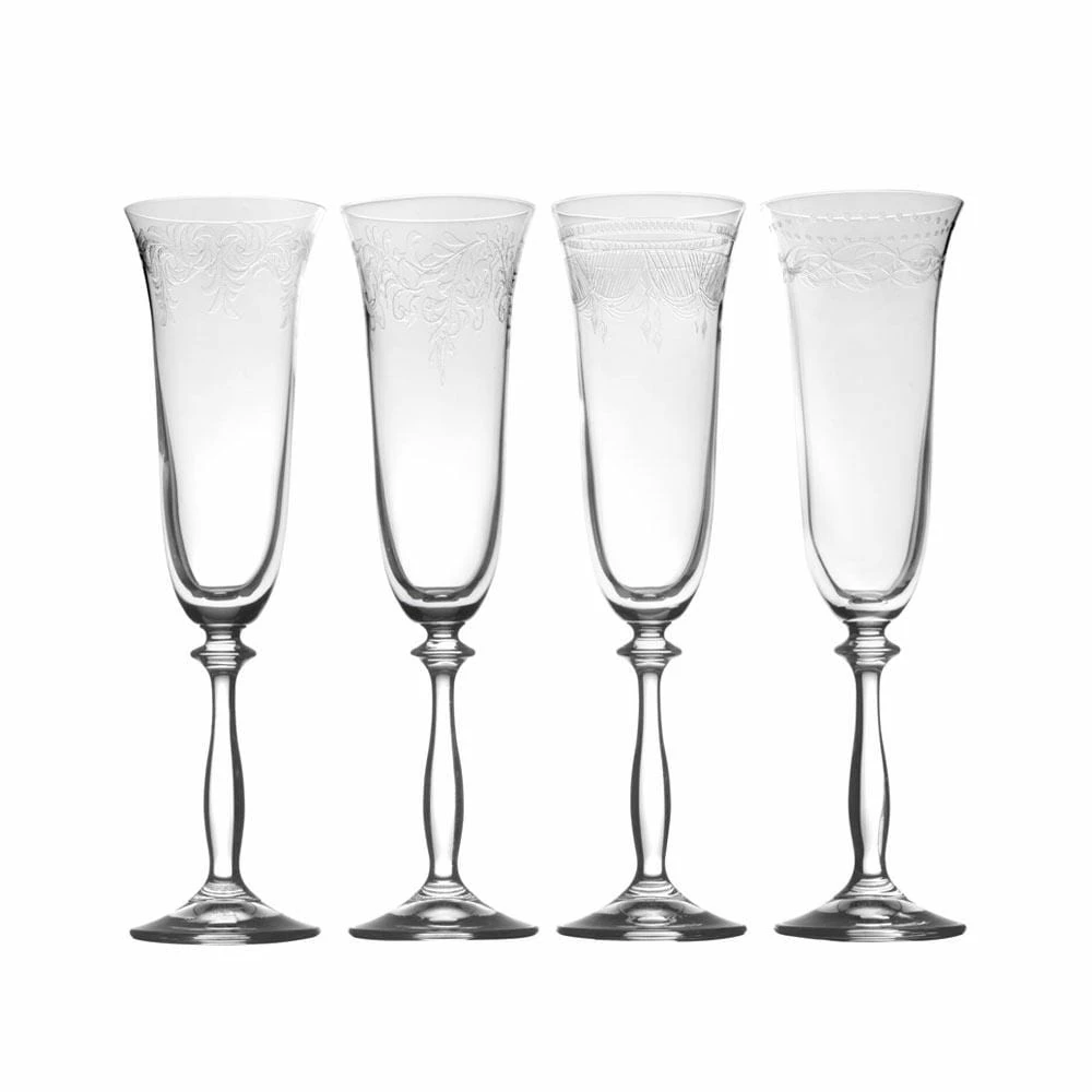 This Mikasa Amelia Set of 4 Flute Glasses features a highly detailed, lace-like pattern that elevates the presentation at all your gatherings. Each glass has a unique design, creating an eclectic and subtly ornate style on the table and allowing individuals to easily identify their glass.