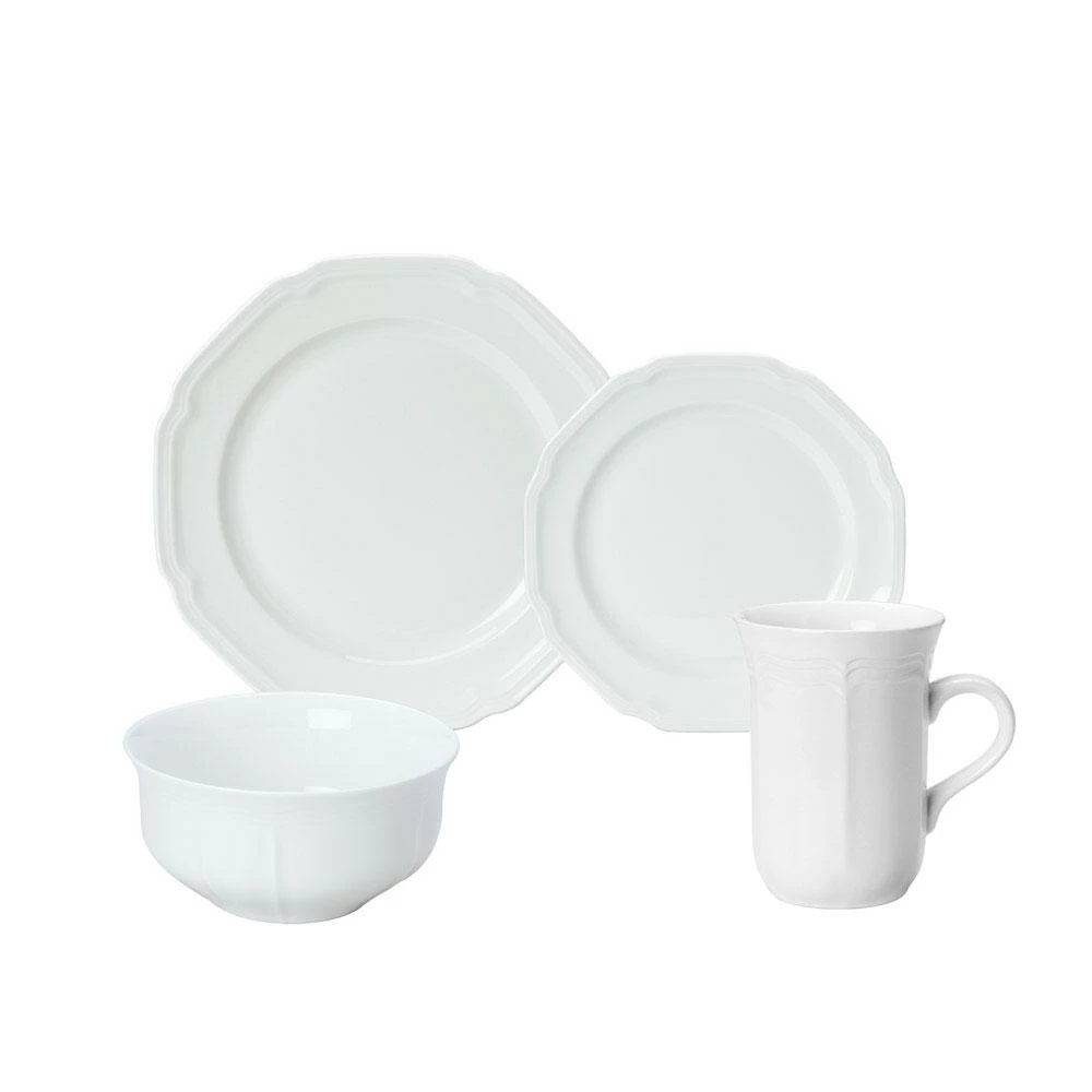 This uniquely-shaped all-white design adds a touch of elegance to a traditional setting. It coordinates perfectly with both formal and casual stemware and flatware as well as our own Antique Orchard pattern. There is a complete suite of accessories to create a classically stylish casual dining statement. This high quality porcelain pattern is dishwasher safe, microwave safe and chip resistant. This 4 piece place setting includes a 10-1/2 inch dinner plate, 8-1/2 inch salad plate, 6 inch diameter x 3 inch high cereal bowl (30 ounce) and a 14 ounce cappuccino mug.