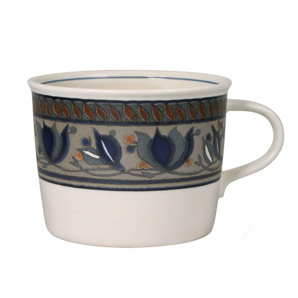This elegant casual stoneware dinnerware has been a favorite since its introduction in 1986. The bold stylized navy blue tulips and vines on a rustic background flow around each of the pieces. Add the creamer and sugar, oval covered casserole, or any of the accessory pieces to expand your elegantly casual table. And once the dinner is over, all the pieces can go in the dishwasher for easy clean up. The pattern is also oven safe, microwave save and freezer safe. Jumbo soup mug measures 4-3/4 inch diameter x 3-1/2 inch high and holds 24 ounces.