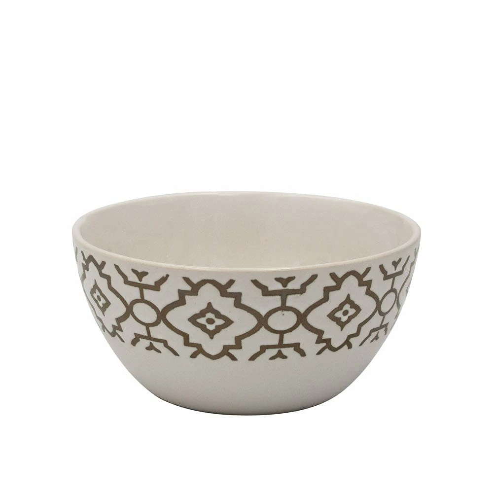 This Celebrations Arabesque Soup Cereal Bowl features a white background with a distinct gold band pattern around the upper rim, and will add a stylish, festive look to your table.