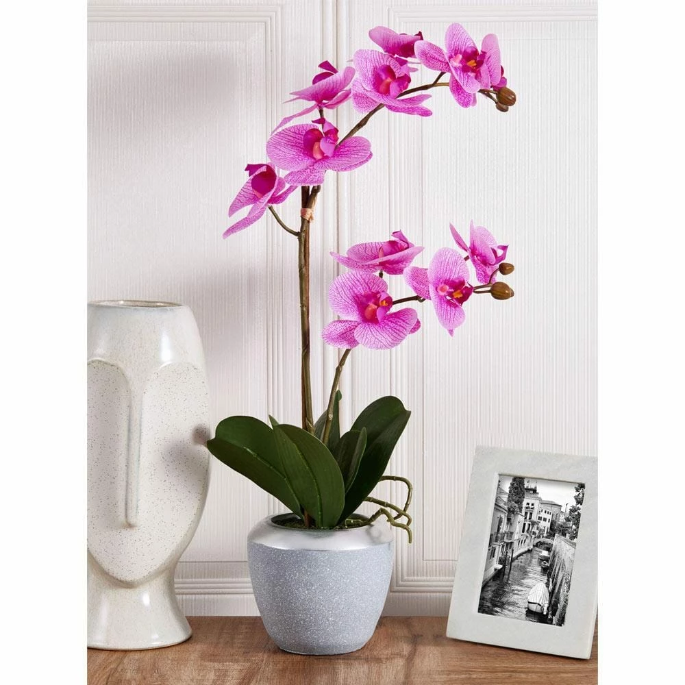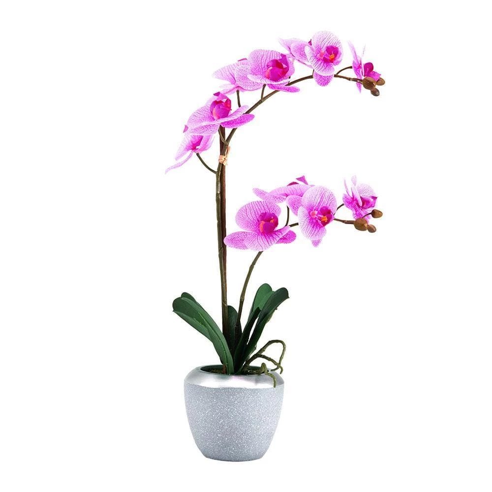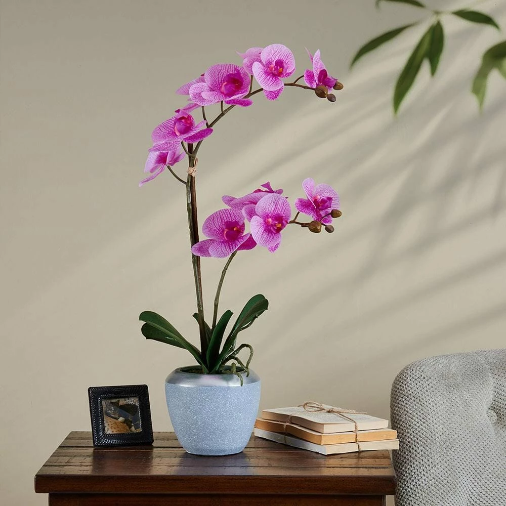 This Mikasa Artificial Purple Orchid Plant with Blue Pot features life-like orchids in a decorative pot, and the stems feature a hidden wire for bending orchids into a unique shape. Artificial florals are the perfect low-maintenance solution to bringing the beauty of fresh flowers into your home; no sunlight or watering required.