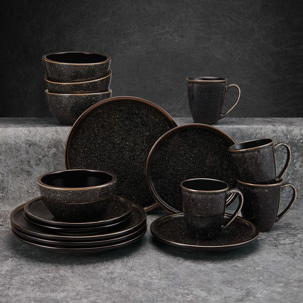 This Mikasa Barrett Black Dinnerware Set features a black speckle pattern that dazzles with a glossy finish and a thick metallic band around the edge, bringing a stunningly modern look to all your gatherings.