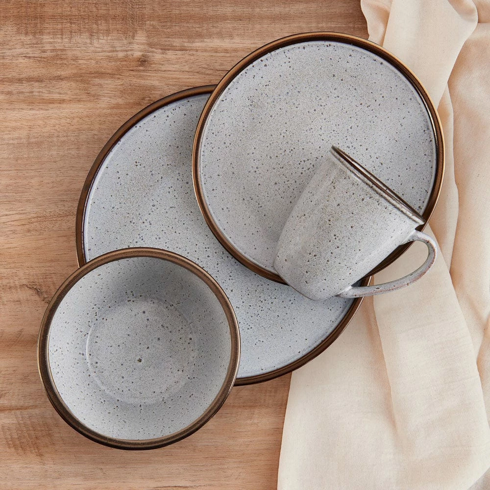 This Mikasa Barrett White Dinnerware Set features a white speckle pattern that dazzles with a glossy finish and a thick metallic band around the edge, bringing a stunningly modern look to all your gatherings.
