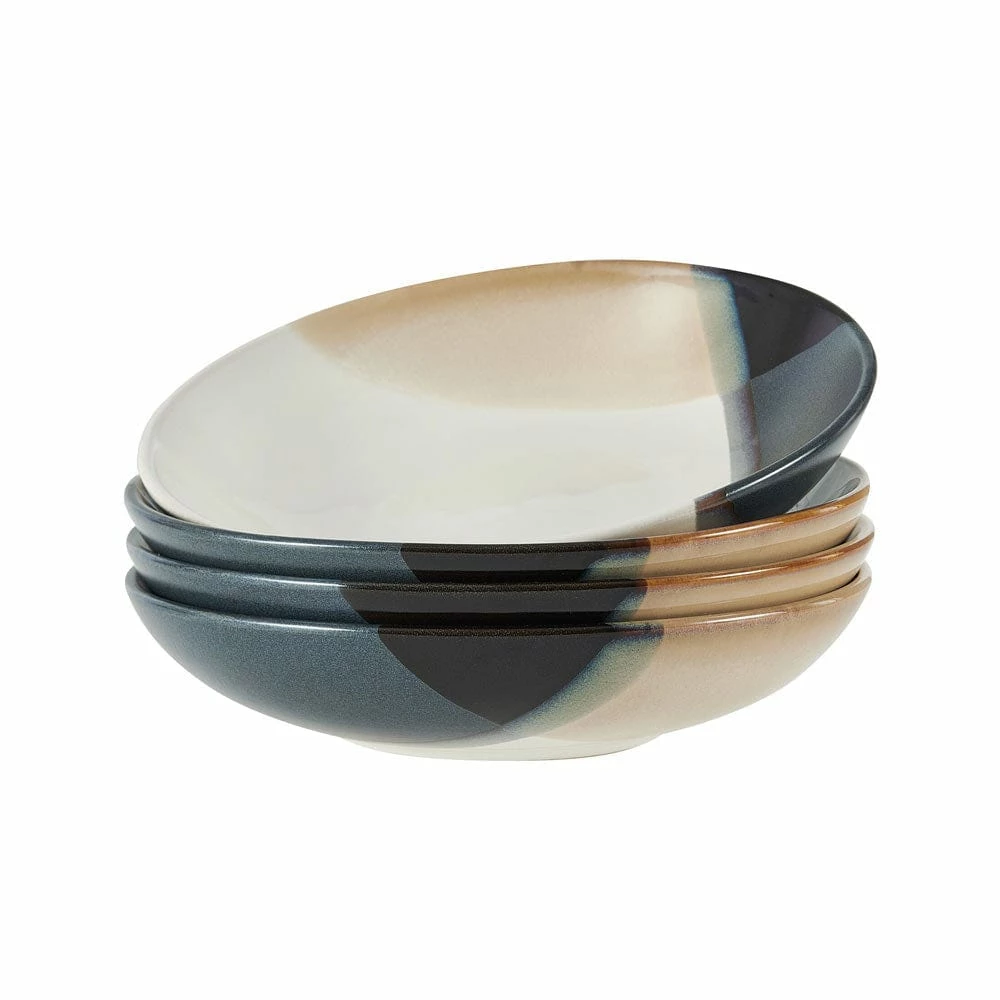 This Gourmet Basics Caden Set of 4 Pasta Bowls features a white background with angles and lines of black and tan geometrics that create corners along one side, in a reactive glaze finish. Due to the nature and hand-crafted qualities of reactive glaze, no two pieces are exactly alike and will exhibit unique variations in color and pattern. Product may slightly differ from image shown.