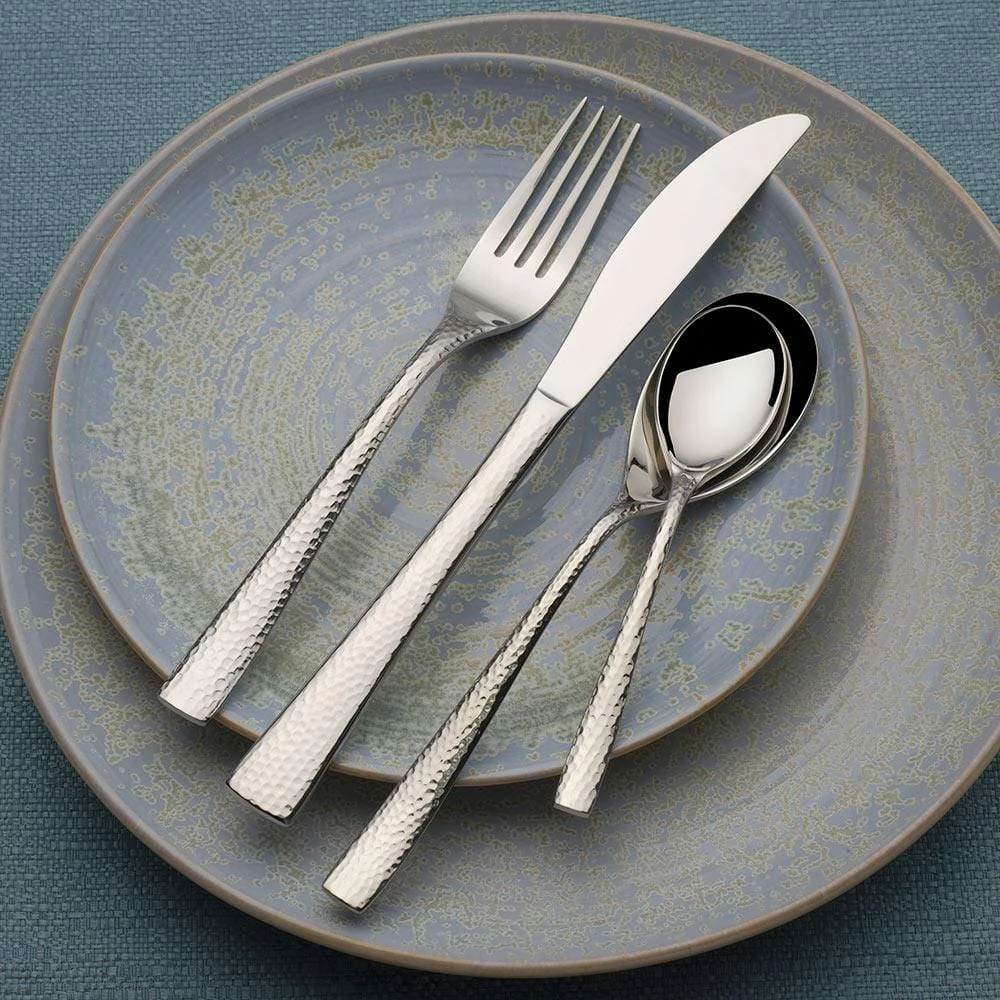 Towles Carita Flatware Set will add a touch of modern elegance to your tabletop display. Crafted of stunning 18/10 stainless steel, this set offers sleek, slim handles and a gently curved profile, which is a striking contrast to the eye-catching, hammered pattern that adorns each piece. The distinct look is the perfect way to bring a touch of sophistication to all your dinner gatherings. 16 piece flatware set, service for four, includes (4) each: dinner fork, dinner knife, dinner spoon, and teaspoon. Dishwasher safe.