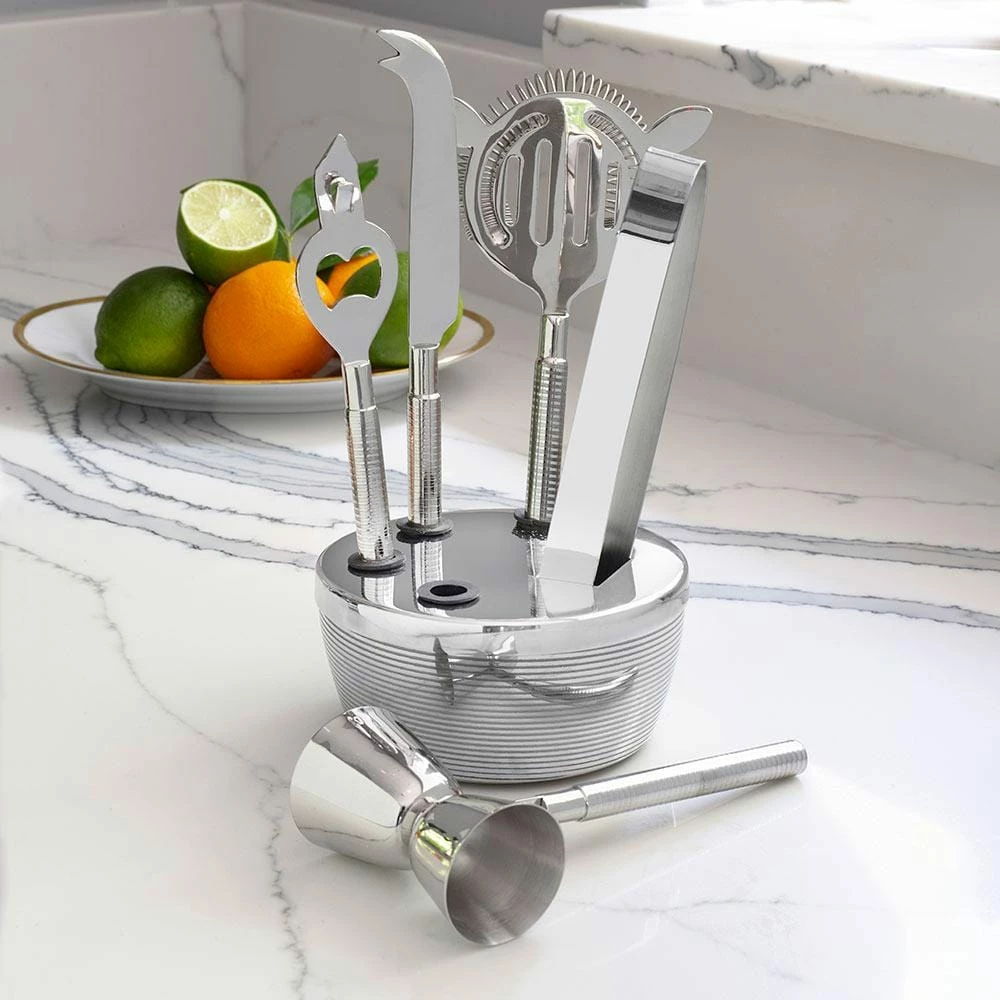 The fun and whimsical designs of the Cheers collection set a festive mood at any gathering. This 6 Piece Stainless Steel Bar Tool Set is adorned with fun lines throughout the handles and on the bowl. The bar tools sit in a stand that also sits in a small bowl; the bowl can also be used for nuts or snacks. 6 piece set includes (1) each: double jigger, tongs, strainer, bar knife, bottle opener and a snack bowl. Bar tools measure between 6-1/2 inches to 8-1/2 inches long. Dishwasher safe.