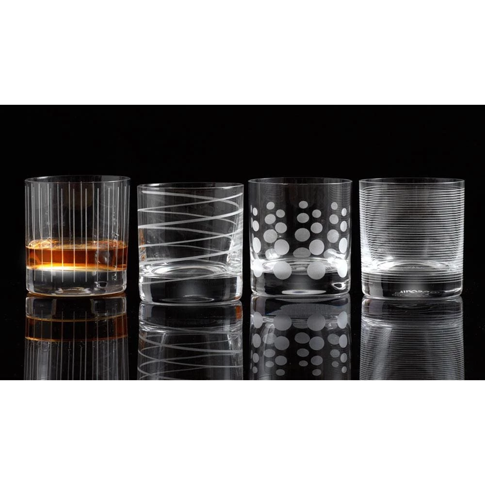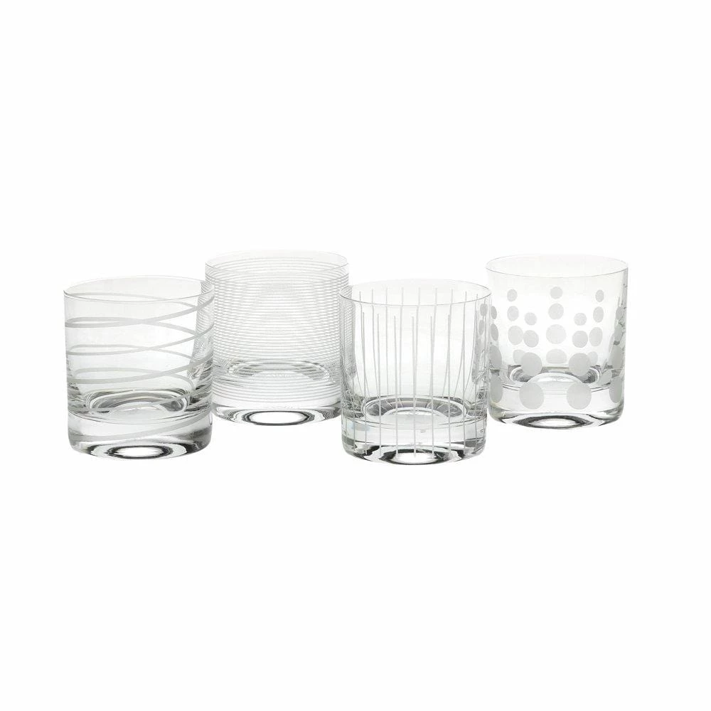 The fun and whimsical designs of the Cheers collection set a festive mood at any gathering. Each glass in the set of 4 is precision-etched with a different yet coordinating design. The dots, lines, and swirls are also distinctive to easily identify your glass. Dishwasher safe – top rack recommended. Set of 4 double old fashioned glasses, each holds 12-3/4 ounce.