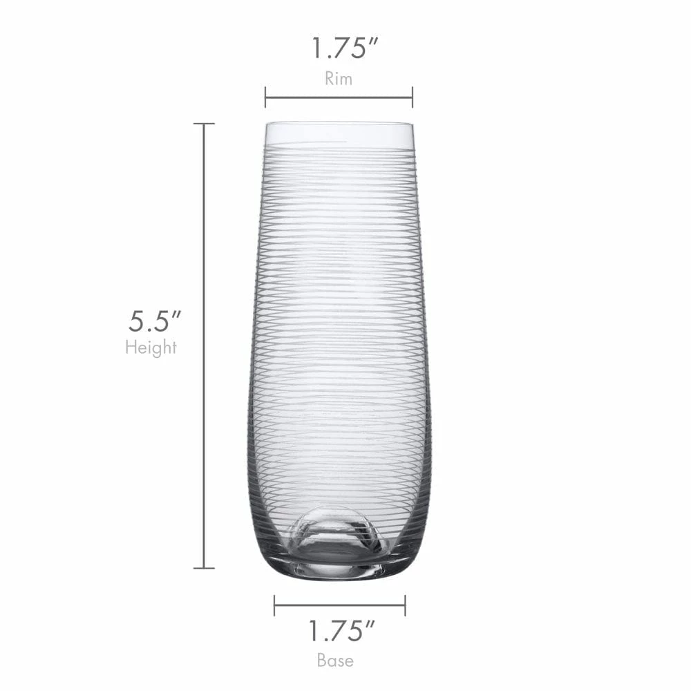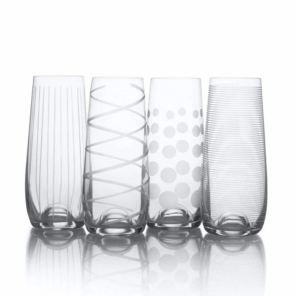 The fun and whimsical designs of the Cheers collection set a festive mood at any gathering. Each glass in the set of 4 is precision-etched with a different yet coordinating design. The dots, lines and swirls are also distinctive, so each of your guests can easily identify their glass.