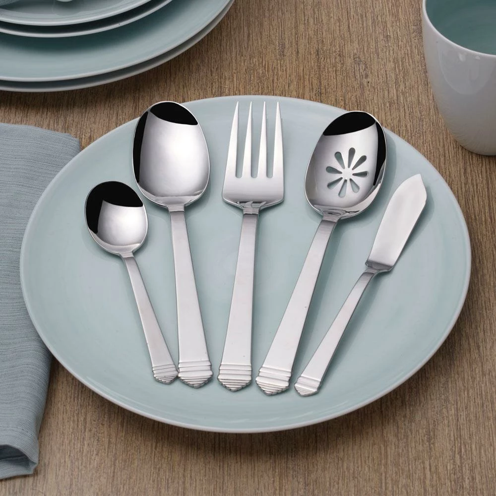 This Towle Colonnade Flatware features a simple, classic shape that will add simple elegance to your decor and its an easy match for any table setting. Crafted of 18/10 stainless steel. 45 piece set, service for eight, includes (8) each: dinner fork, salad fork, dinner knife, dinner spoon and teaspoon, PLUS (1) each: tablespoon, pierced tablespoon, cold meat fork, sugar spoon and butter knife. Dishwasher safe.