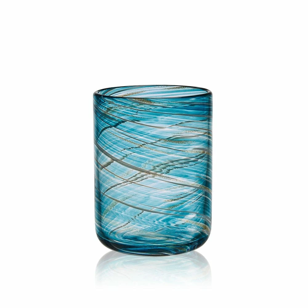 The Color Swirl Double Old Fashioned Glasses are uniquely handcrafted and feature contemporary curves, bold silhouettes, and distinct delicate bubble accents, in vibrant shades of blue swirling around the body, highlighted by metallic gold flecks that sparkle in the light, bringing modern allure to your parties and dinner gatherings.
