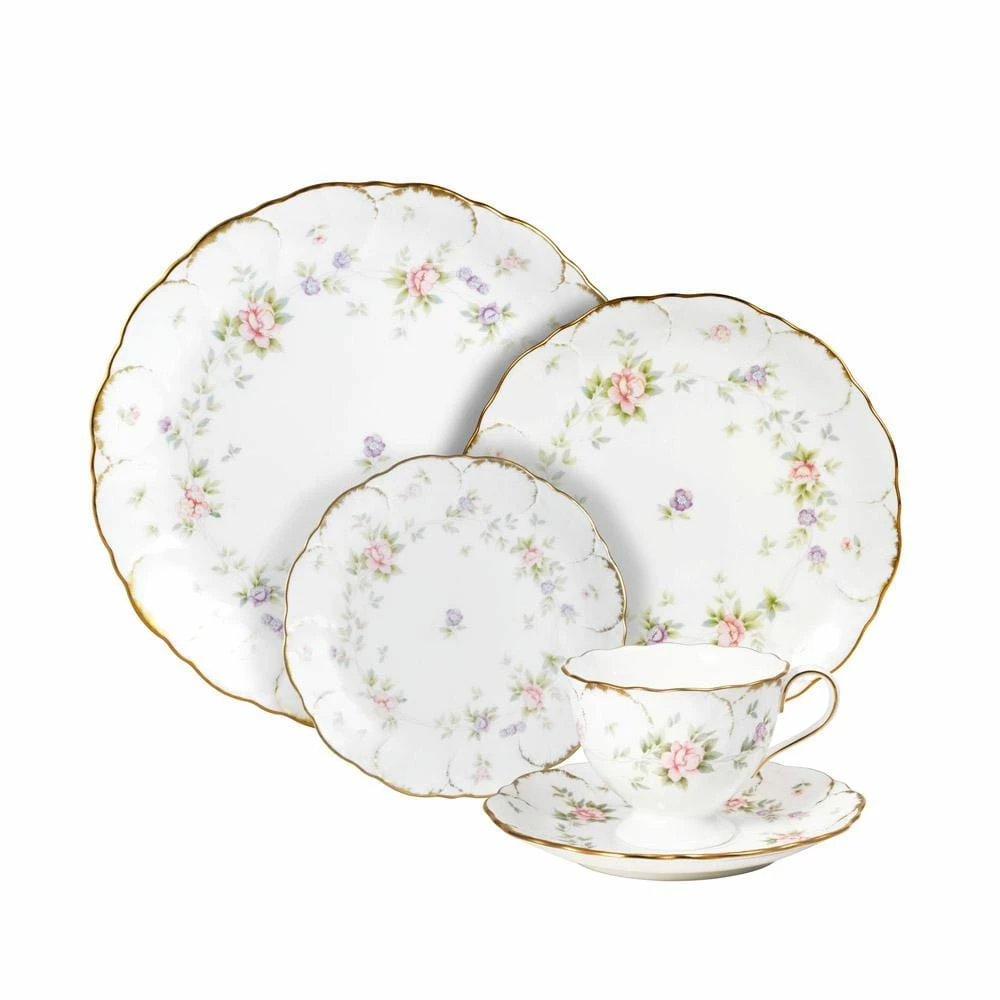 Brought back by popular demand! Endearment gives a classic floral pattern a touch of contemporary flair while retaining the traditional elements that make the style so enduring. A garland of delicate flowers in a soft palette frame a single center flower, and the scalloped shapes of each piece in this dinnerware collection are accented by gentle gold highlights. Constructed of Bone China. Hand wash only. Each service includes: 10-1/2 inch dinner plate, 7-3/4 inch salad plate, 6-1/2 inch bread & butter plate, 6 ounce teacup and 5-3/4 inch saucer.
