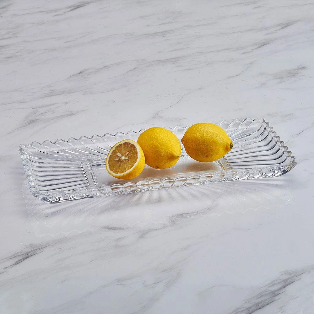 This Estate Crystal Rectangular Tray features a brilliant design with an alluring ridge pattern, unique angles and curves that will shine stunningly in the light, and will add a touch of elegance to your table.