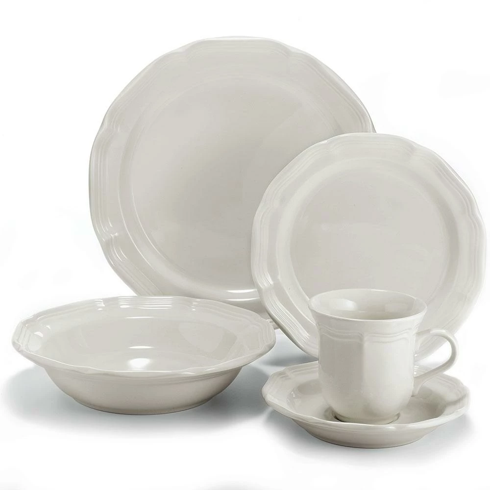 Gently scalloped edges and curves on these generous sized pieces add grace every time you set the table. Its rich cream color makes French Countryside a perfect base pattern to mix with colorful accent pieces. A best selling pattern, a complete suite of accessories is available to create a classically stylish casual dining statement. Expertly crafted from stoneware. Microwave and dishwasher safe. This 20 piece set, service for four, includes (4) each: 10-3/4 inch dinner plate, 8-1/4 inch salad plate, 8-1/4 inch (15 ounce) rim soup bowl, 8-1/2 ounce tea cup and 6-1/4 inch tea saucer.
