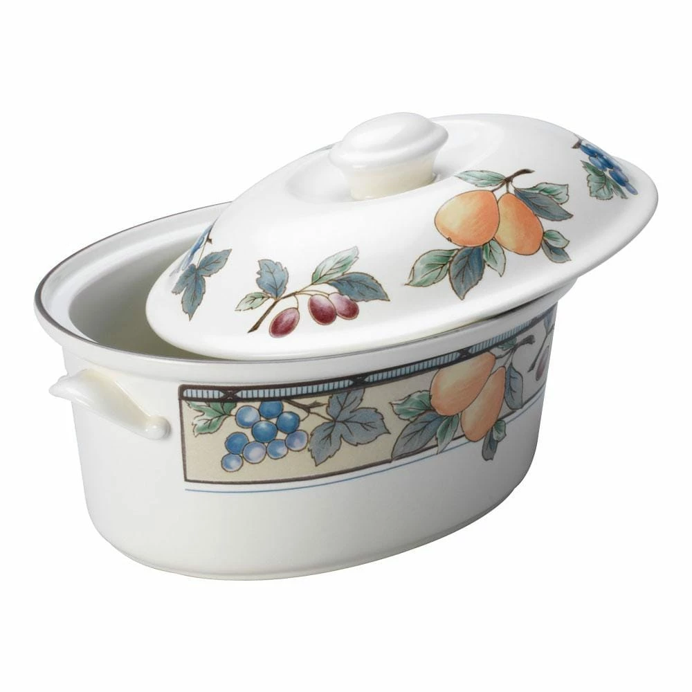 Colorful fruits and leaves enliven the Garden Harvest pattern. This longtime favorite is perfect for everyday use and has a wide array of accessories to create a complete casual dining statement. This pattern coordinates perfectly with casual stemware and flatware and is dishwasher safe, oven safe, freezer safe and microwave safe. Crafted of stoneware. Covered casserole measures 10-1/2 inch long x 7 inch wide x 6 inch high and holds 2 quarts.