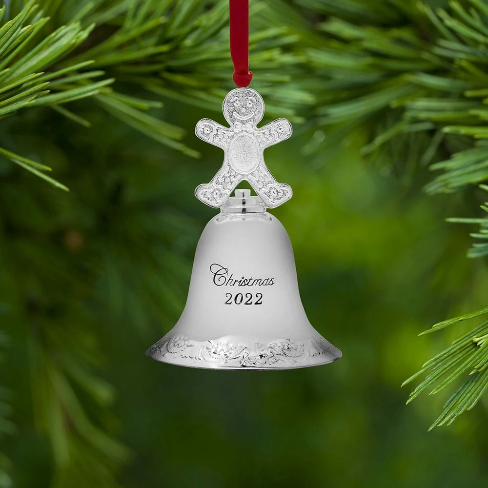 From our family of brands, this Wallace Grande Baroque 2022 Silver Plated Bell Ornament is the 28th edition in this annual series. The words “Christmas 2022” are prominently on the front, and features an adorable Gingerbread Man finial. This limited edition ornament will make a beautiful adornment for any tree or mantel piece.