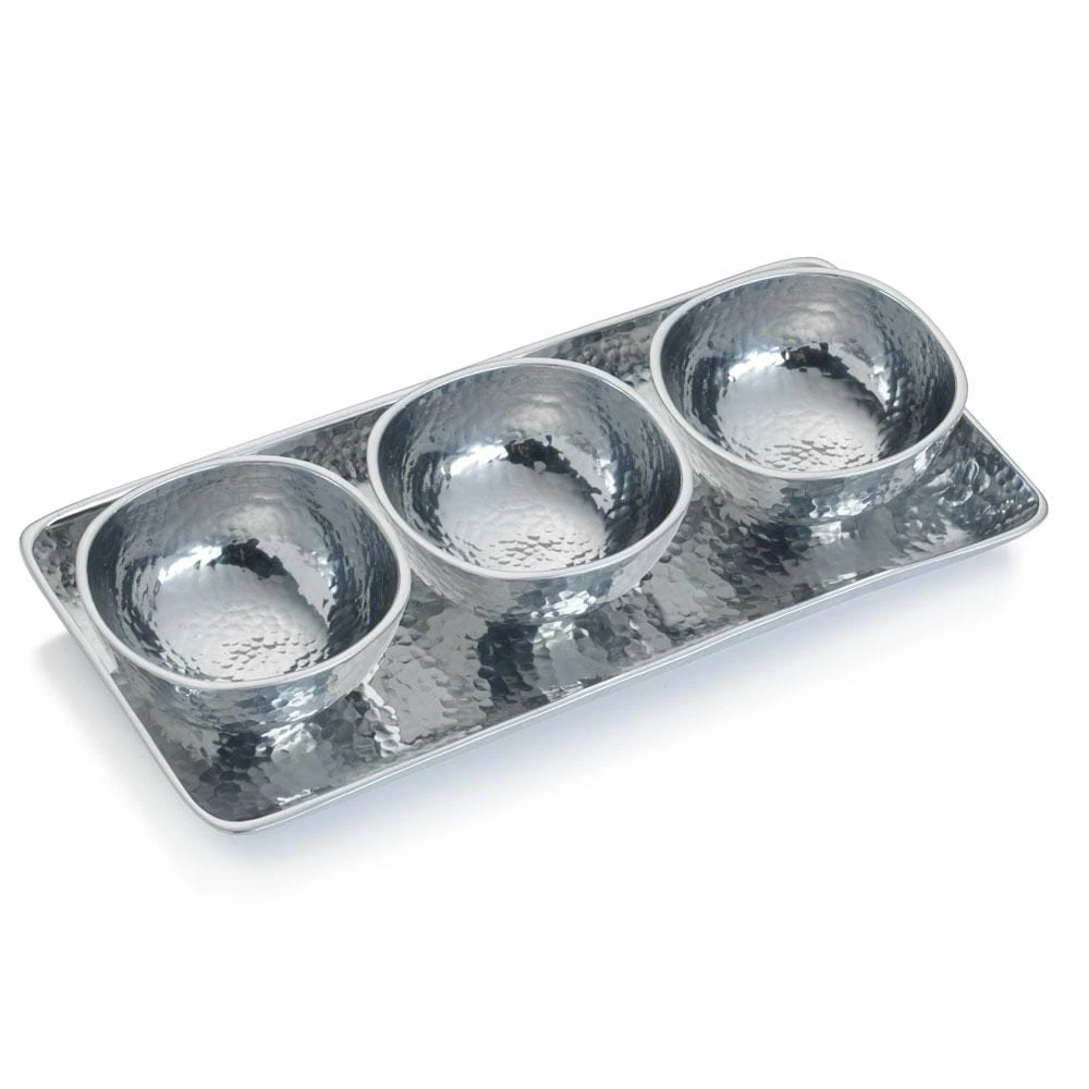 This Towle Hammersmith Set of 3 Small Bowls on Tray is an elegant addition to your serveware and is perfect for bringing condiments, dips. and more to your guests. Featuring a rustic hammered finish, this durable set is crafted of food-safe alternative metal alloy, which will not scratch or dent under normal use. Tray measures 11-3/4 x 5-1/2 inches. Each bowl measures 3-3/4 inches in diameter. Hand-wash with warm water and a mild detergent; rinse and dry immediately.