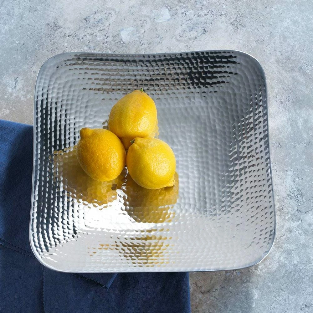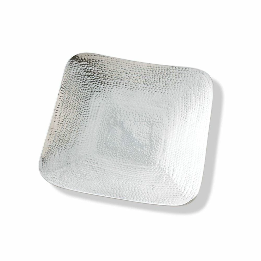Arrange a wide array of food in this elegant square platter. Its durable and has a rustic hammered finish. Crafted of food-safe alternative metal alloy. Will not scratch or dent under normal use. 11 3/4″ square. Oven safe for warming food and freezer safe. Hand wash.