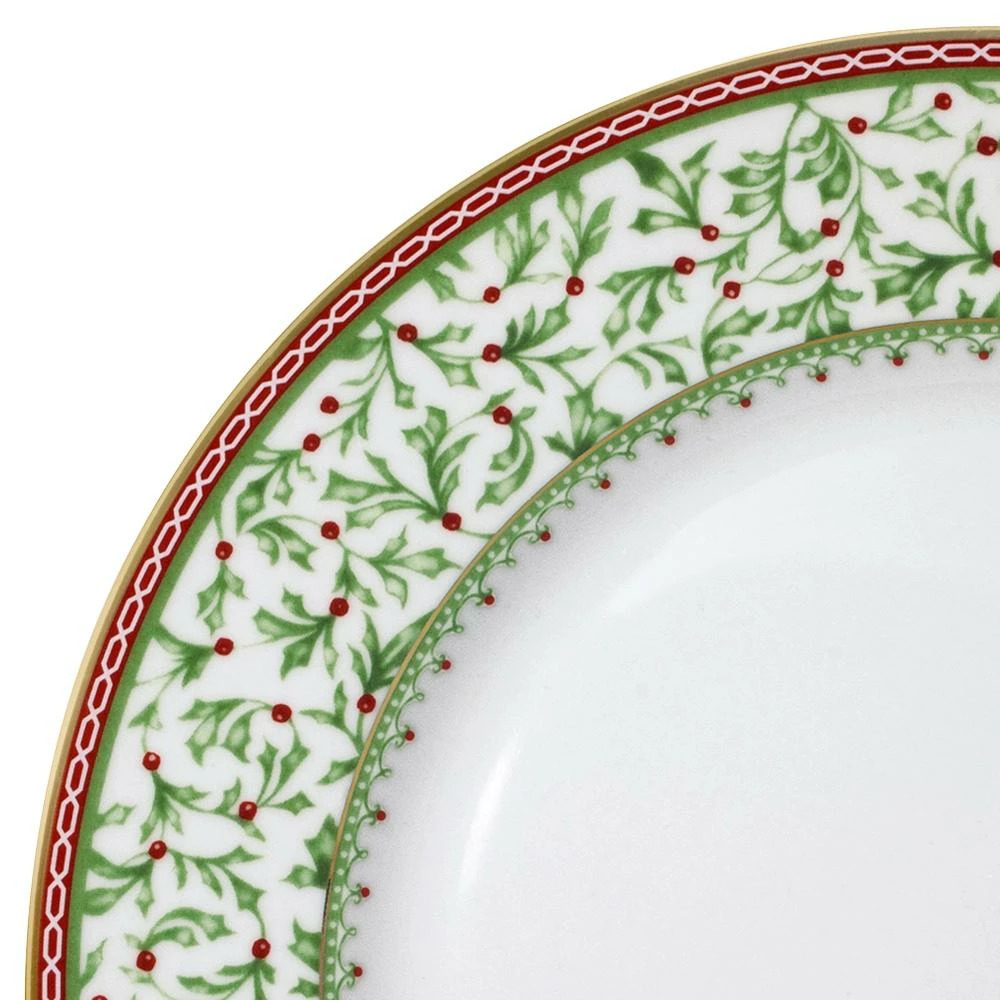 Bring some festive and elegant touches to your holiday celebration with Holiday Traditions. Elegant dinnerware features a charming holly and berry motif with gold banding for a timeless statement. Crafted of porcelain. Dishwasher safe, but not microwave safe. This Each service includes: 10-1/2 inch diameter dinner plate, 8 inch diameter salad plate, 7 inch diameter bread and butter plate and 12 ounce mug.