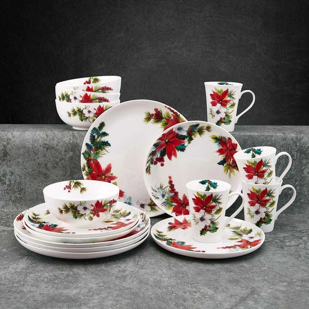 This Mikasa Hope Joy dinnerware is adorned with a watercolor poinsettia and white floral design that will add a festive feel to your table.