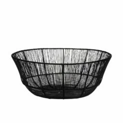 This Jaxon Fruit Basket is perfect for storing and displaying fruit, bread, or other foods, or small everyday items for quick, easy access. Crafted from iron for long-lasting beauty even under rigorous use, this contemporary basket has a black finish and a wire frame design that will add a modern look to a tabletop display. Wipe clean with soft, damp cloth. Basket measures 12 inch diameter x 5 inch high.