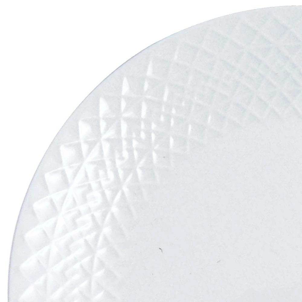 Mikasa Jenna dinnerware features a timeless white design, on a sleek, round coupe shape, with an embossed rim.