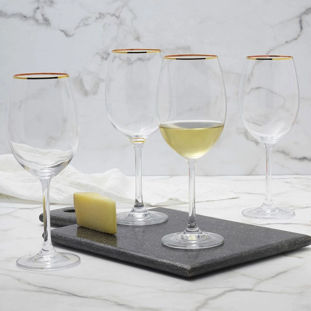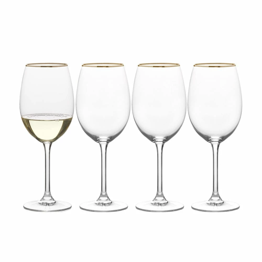 This Mikasa Julie Gold Set of 4 White Wine Glasses features a clear glass design that will shine beautifully in the light, with a hand-painted gold band around the rim, which will bring a touch of sophistication to any occasion.