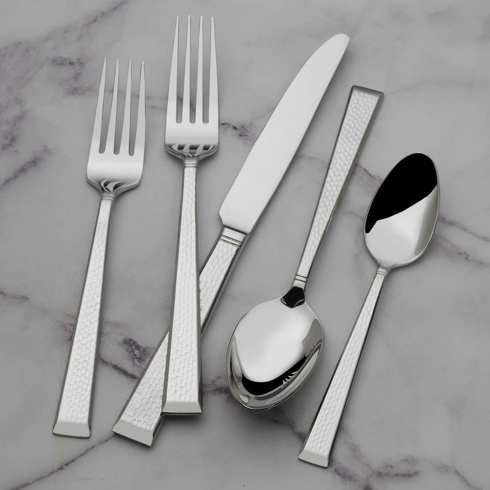 Mikasa Kyler Flatware brings contemporary elegance to the table. Each piece is crafted from premium 18/10 stainless steel to deliver outstanding beauty and performance. A modern hammered texture gives the sleek handles a faceted shimmer that will make a bold statement at every dining occasion. Flatware wears a lustrous mirror finish yet goes safely through the dishwasher without needing polishing. 65 piece set, service for twelve, includes (12) each: dinner fork, salad fork, dinner knife, dinner spoon, and teaspoon, plus (1) each: tablespoon, pierced tablespoon, cold meat fork, sugar spoon and butter knife. Dishwasher safe.