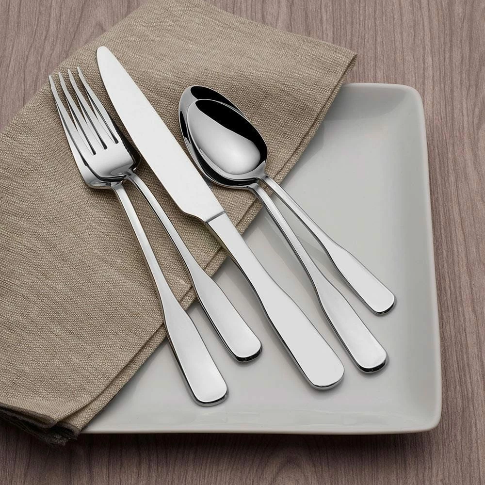 This Landyn Flatware Set will bring modern design to your tabletop for any occasion. Beautifully crafted of 18/0 stainless steel to stand up to the rigors of everyday use, this elegantly understated collection features a smooth, mirror finish and eye-catching handles that are narrow at the neck, leading to a dramatic widening halfway down to the tip. The perfect way to complement any dinnerware or stemware. 20 piece flatware set, service for four, includes (4) each: dinner fork, salad fork, dinner knife, dinner spoon, and teaspoon. Dishwasher safe.