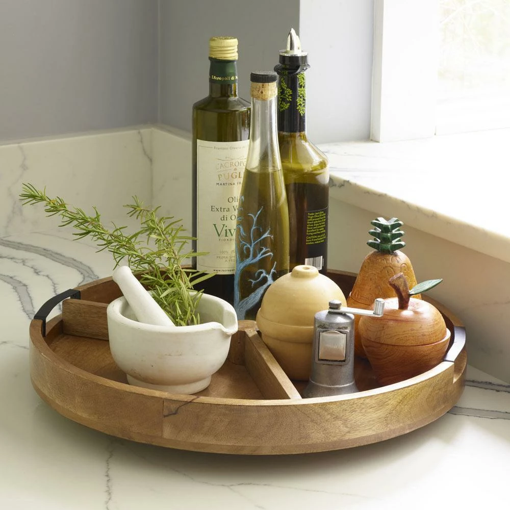 This Gourmet Basics Lazy Susan Mango Wood Serve Tray is perfect for serving and keeping items in order on your table, and includes a removable divider.