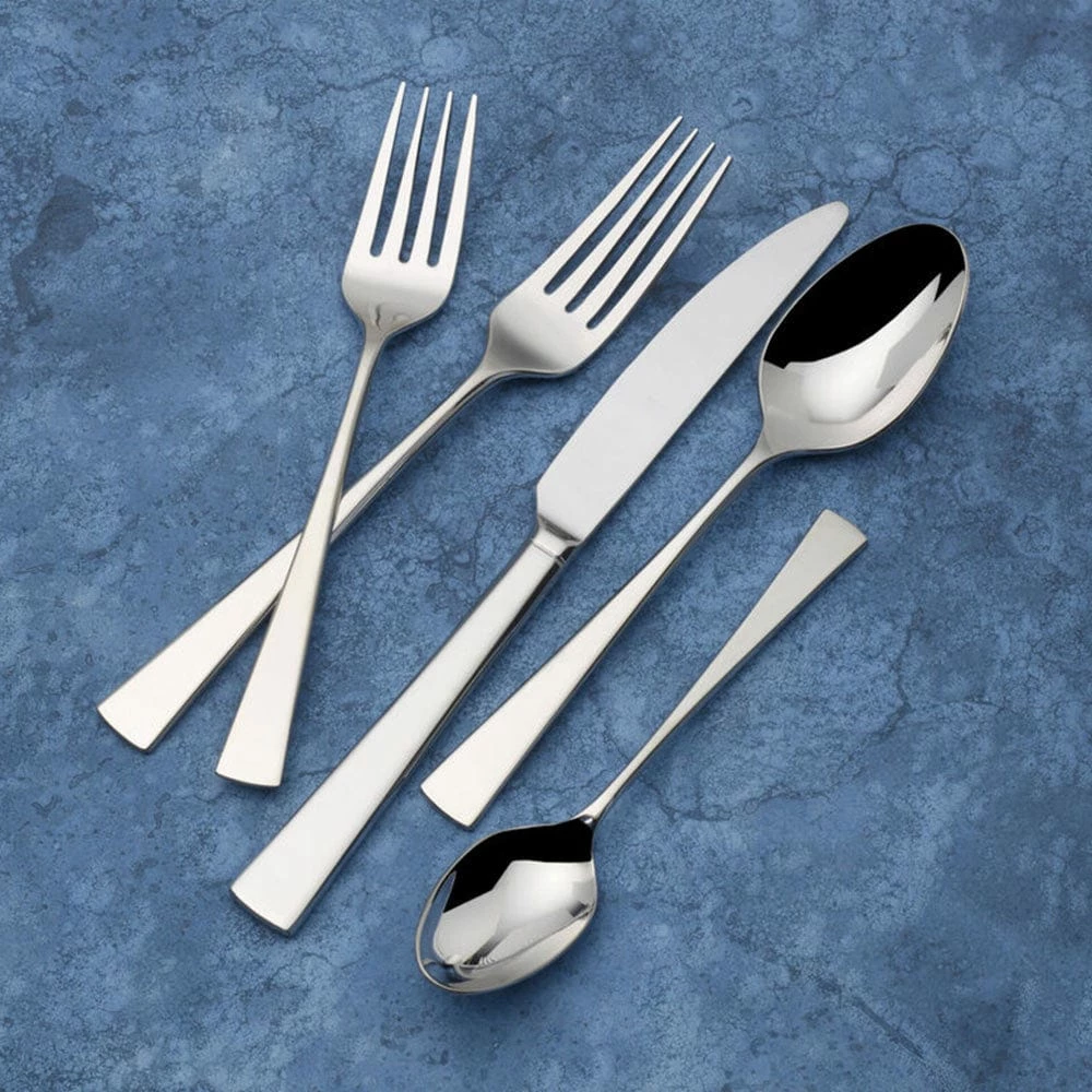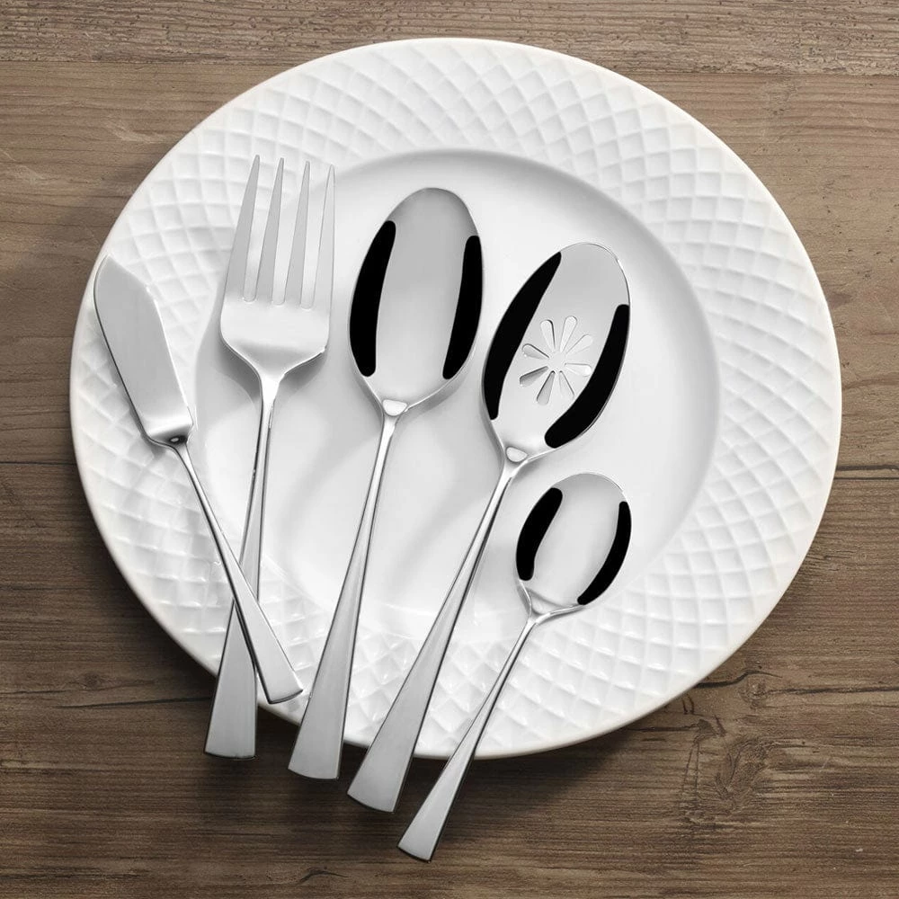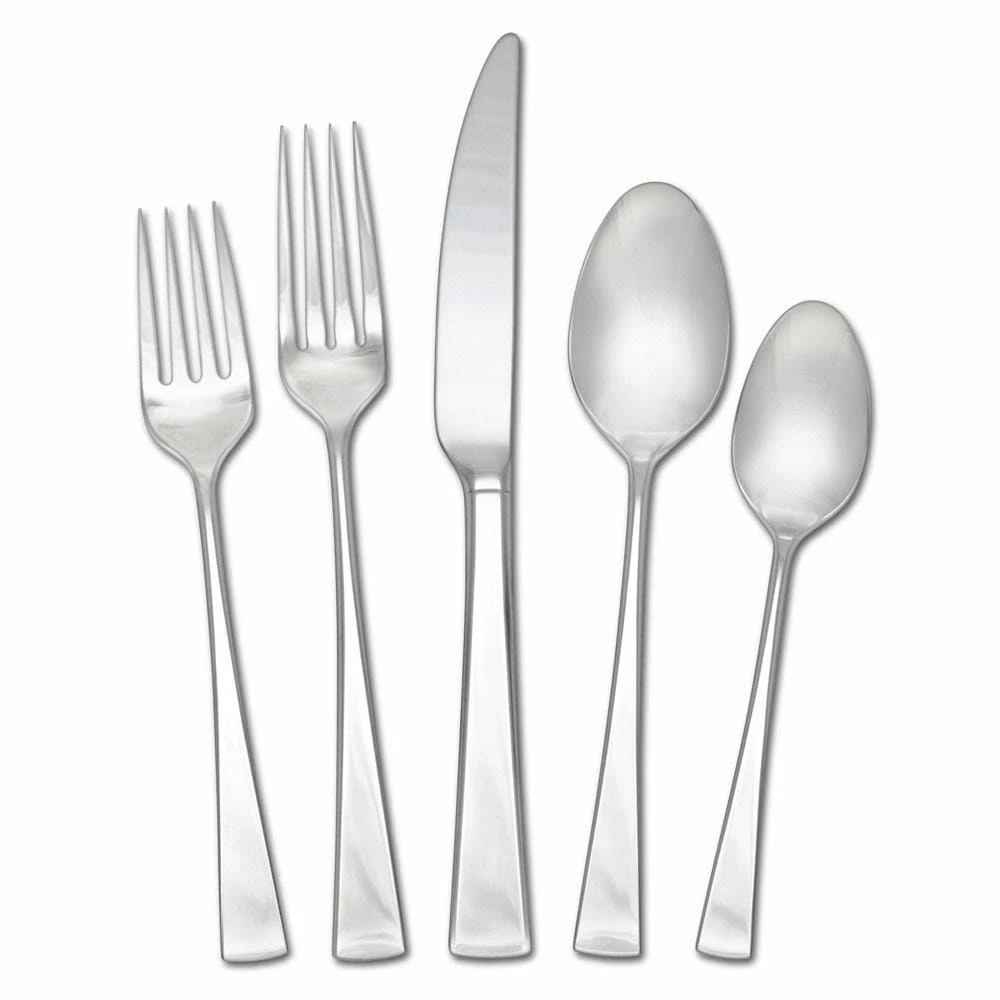 The flat, triangular shaped handles on this Lucia Flatware Set, by Mikasa, creates a sleek, elegant design that works for formal or everyday dining. Crafted of superior quality 18/10 stainless steel with a brightly polished, mirror finish. 65 piece flatware set, service for twelve, includes (12) each: dinner fork, salad fork, dinner knife, dinner spoon and teaspoon, PLUS (1) each: tablespoon, pierced tablespoon, cold meat fork, sugar spoon and butter knife. Dishwasher safe.