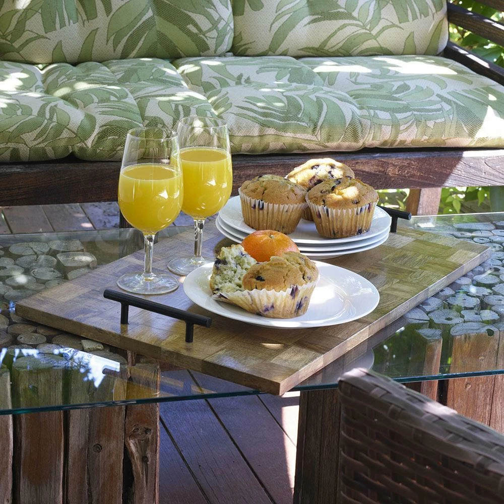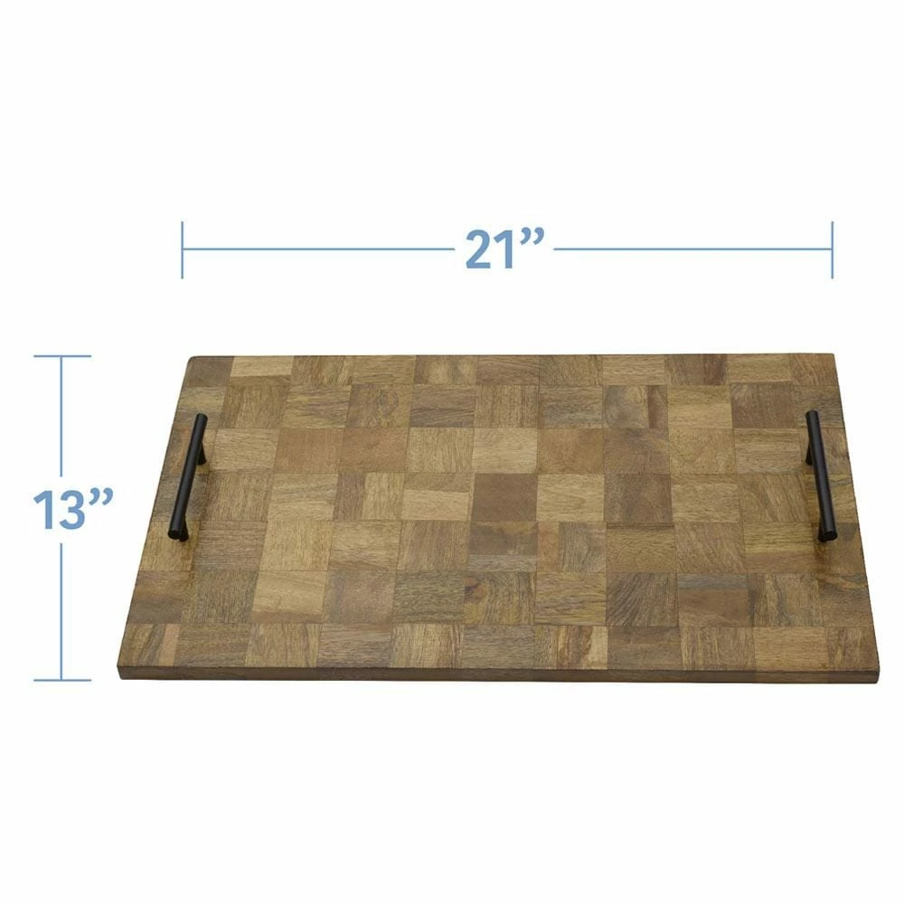 This Mango Wood Checkered Serve Tray features a unique checkered pattern in varying wood grain colors, with iron handles, providing easy carrying when transporting. The tray is generously sized to accommodate several serving bowls or plates at once. Crafted of mango wood with wrought iron handles. Wipe clean with a damp cloth. Tray measures 21 inch long x 13 inch wide x 2-1/2 inch high.