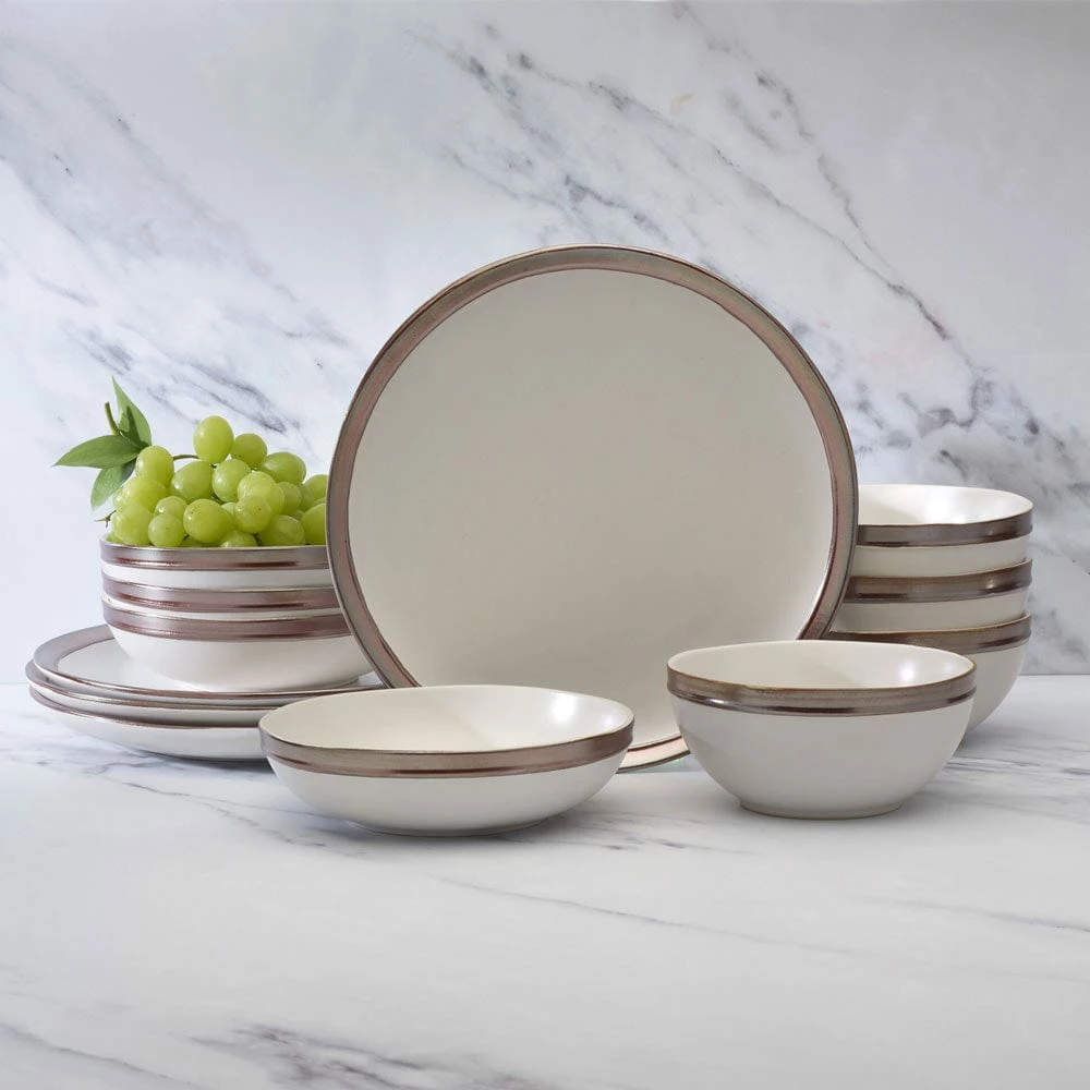 This Miller White Dinnerware Set features a white reactive glaze, on subtle organic shapes with rose gold banding, and will brighten your everyday table. Due to the nature and hand-crafted qualities of reactive glaze, no two pieces are exactly alike and will exhibit unique variations in color and pattern. Product may slightly differ from image shown.