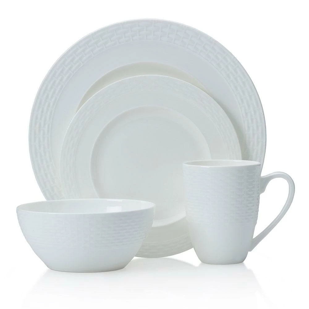The Ortley dinnerware features a delicately embossed weave design that decorates the rims and edges of each piece. Perfect for everyday use, it can be dressed up or down for any occasion. Constructed of bone china. 16 piece dinnerware set, service for four, includes (4) each: 10-3/4 inch dinner plate, 8-1/2 inch salad plate, 6 inch diameter (28-3/4 ounce) soup cereal bowl and 16 ounce mug. Chip resistant, microwave, dishwasher, freezer and oven safe.