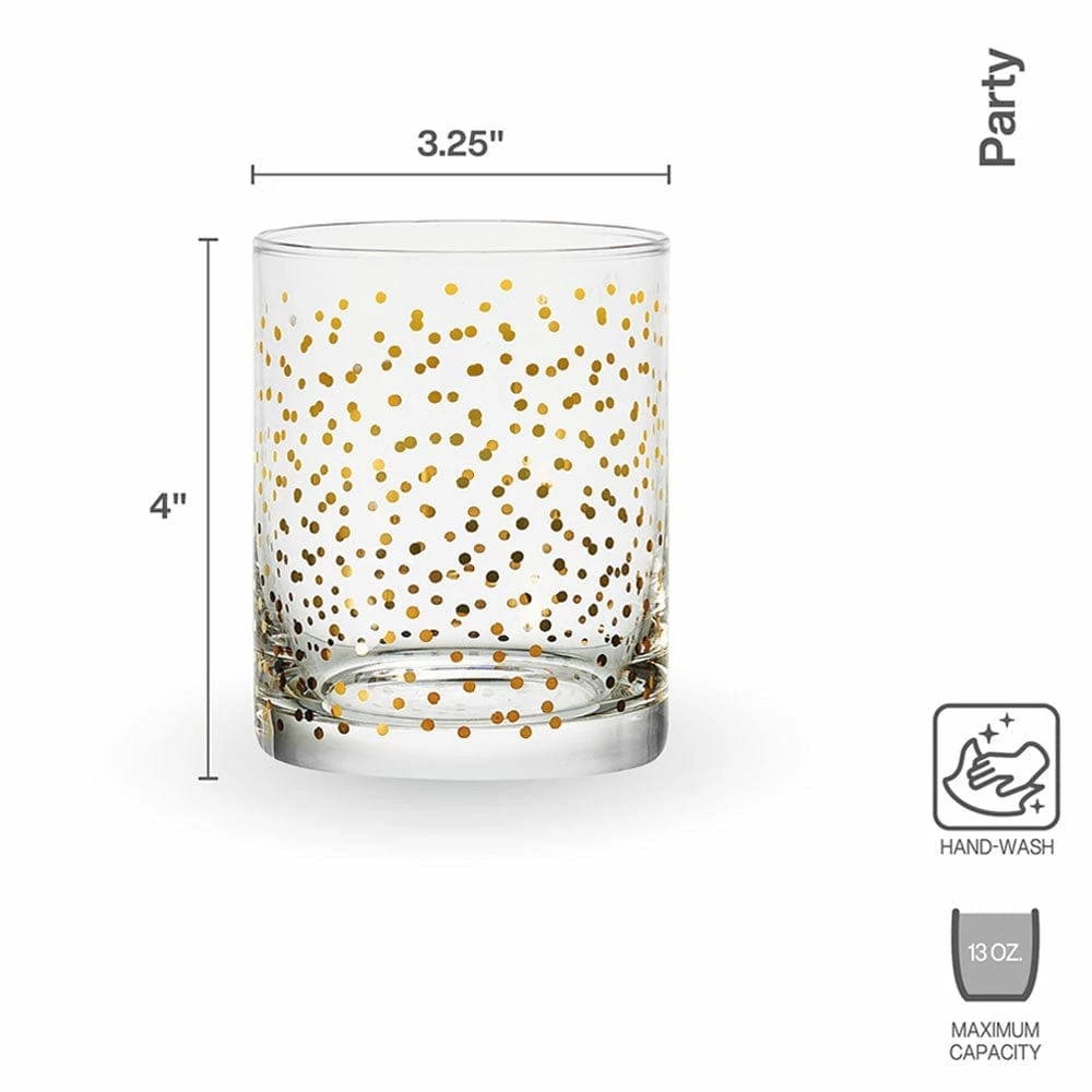 This Party Double Old Fashioned Whiskey Glass Set is sleek and streamlined with contemporary curves, and adorned with patterns of glittery gold and silver, featuring four distinct celebratory patterns, like sparkly confetti, shimmery bubbles, twinkling stars, and firework bursts.