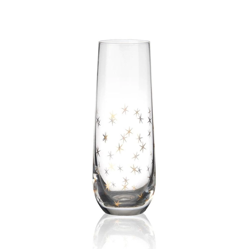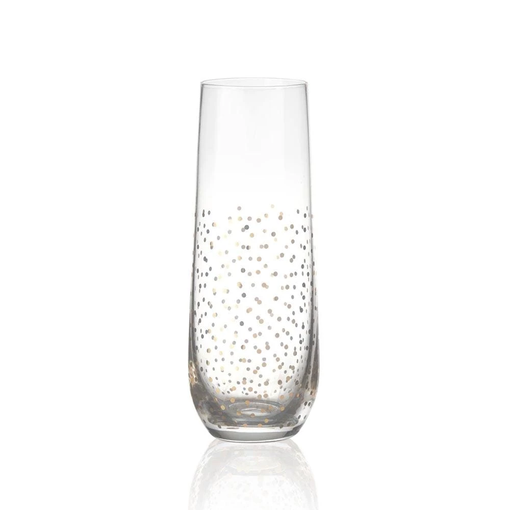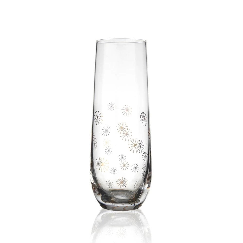 This Party Set of 4 Gold Stemless Toasting Flutes are adorned with patterns of glittery gold and silver, featuring four distinct celebratory patterns, like sparkly confetti, shimmery bubbles, twinkling stars, and firework bursts. Hand wash only. Set of 4 stemless flutes, each measures 2-1/2 inch diameter x 6-1/4 inch high and hold 9-1/2 ounces.