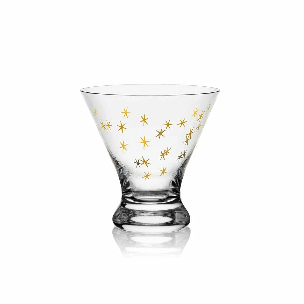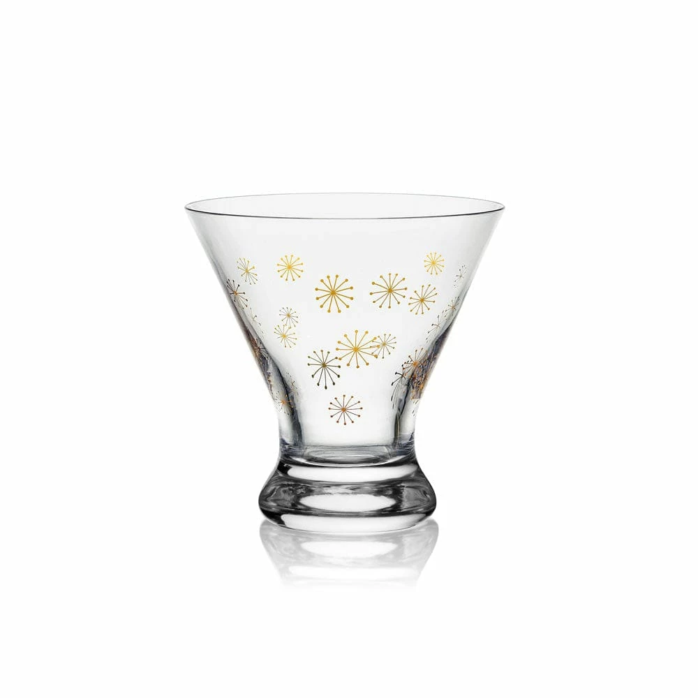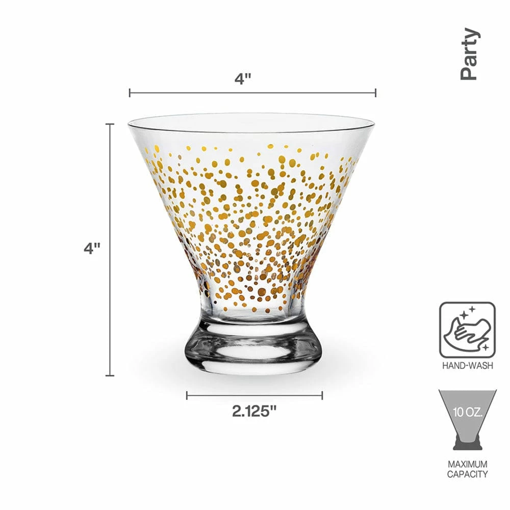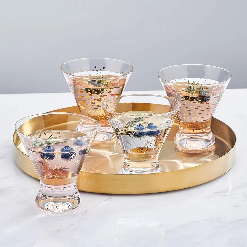 This Party Stemless Martini Glass Set is sleek and streamlined with contemporary curves, and adorned with patterns of glittery gold and silver, featuring four distinct celebratory patterns, like sparkly confetti, shimmery bubbles, twinkling stars, and firework bursts.