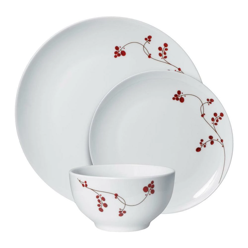 Each sprig of lush red berries featured in Gourmet Basics Red Berries pattern just jump off the plate. The coupe shape offers a large eating area, and the bright white porcelain body is sure to make a wonderful presentation for any meal. 12 piece dinnerware set, service for four, includes (4) each of: 10-1/2 inch dinner plate, 8-1/4 inch salad plate and 5-1/2 inch diameter (21 ounce) cereal soup bowl. Microwave and dishwasher safe.