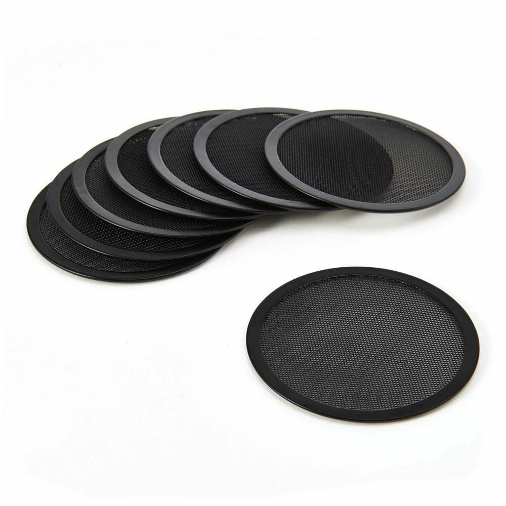 This Gourmet Basics Set of 8 Drink Covers/Coasters will help you enjoy your time outdoors. Crafted of carbon steel with a sleek black finish, these unique discs have a mesh design that keeps critters out of your beverages. Simply place them on top of glasses, cups, and mugs like a lid between sips. They also make stylish coasters to protect surfaces of tables and counters. Wipe clean with a damp cloth. Set of 8, each measure 4-1/4 inch diameter.
