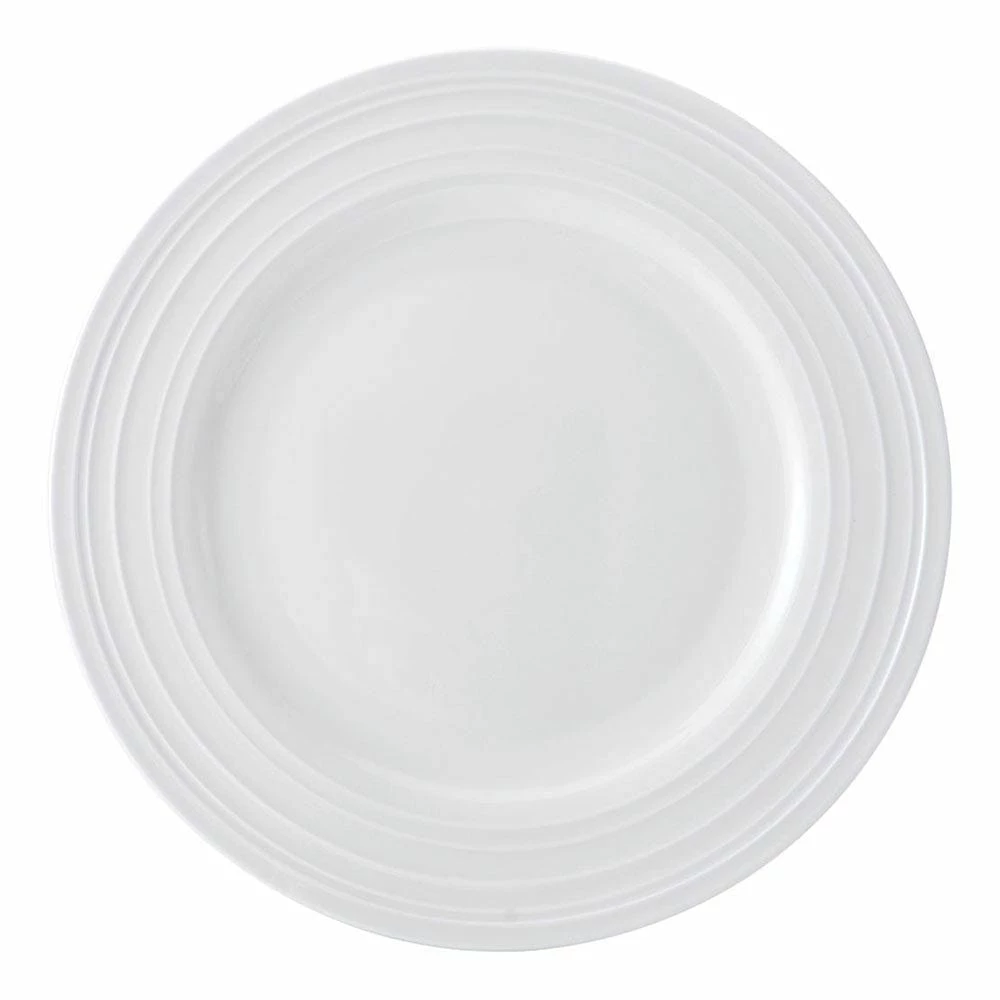This Swirl Bone Dinner Plate features a clean white surface, with a striated line design wrapping around the rim, and will set a striking and original table.