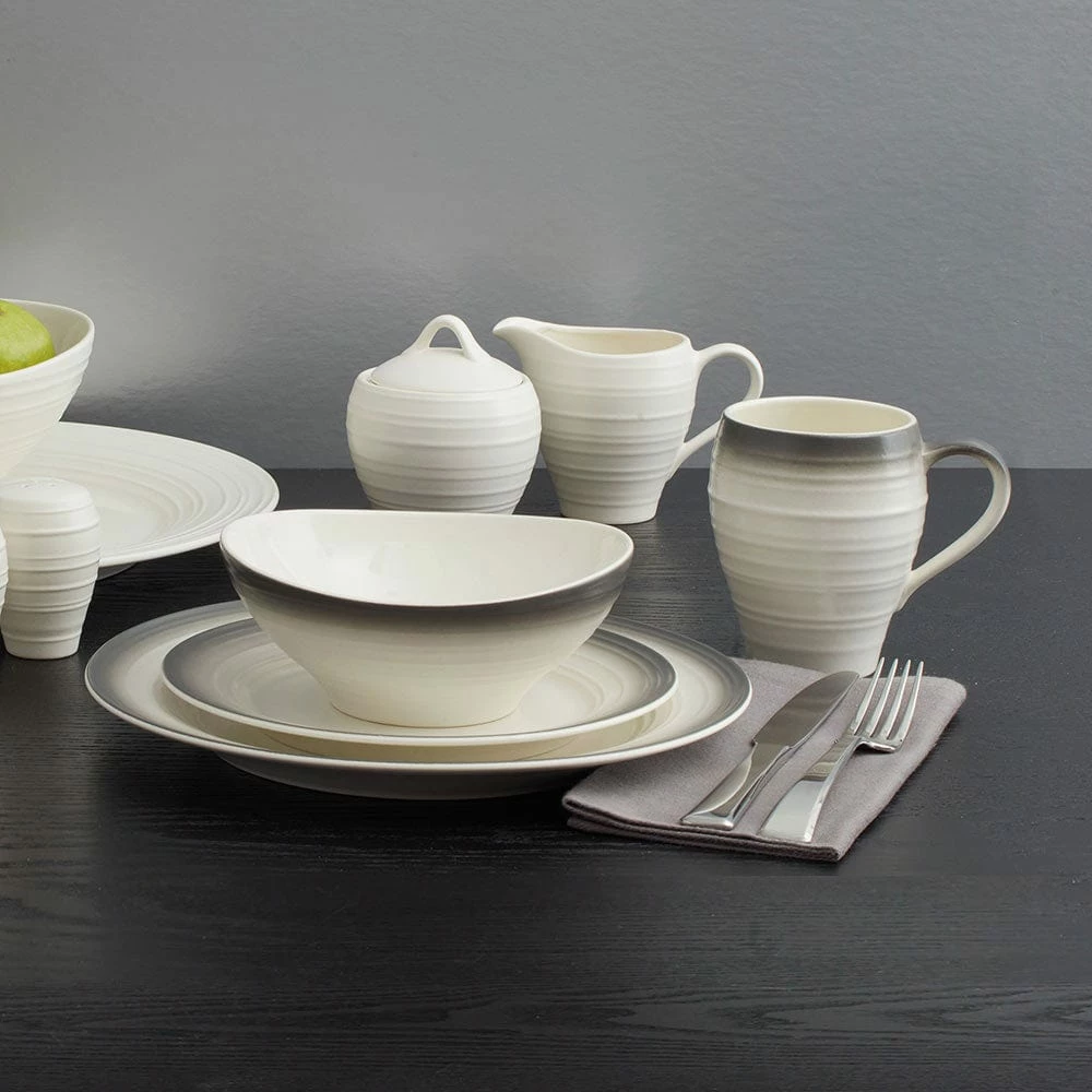 Swirl Ombre features clean lines in a rustic, earthy pattern with a matte and glossy finish, and beautifully graduated coloration, set a striking table setting. The soft rib on the outside of the collection offers a hand made look. Crafted of ironstone with a pin-firing technique which allows the entire bottom of the plate to be glazed, including the base. This process significantly reduces water absorption and increases chip resistance. 16 piece dinnerware set, service for four, includes (4) each: 11-1/4 inch dinner plate, 8-1/2 inch salad plate, 6-3/4 inch (24 ounce) soup cereal bowl and 18 ounce mug. Microwave and dishwasher safe.