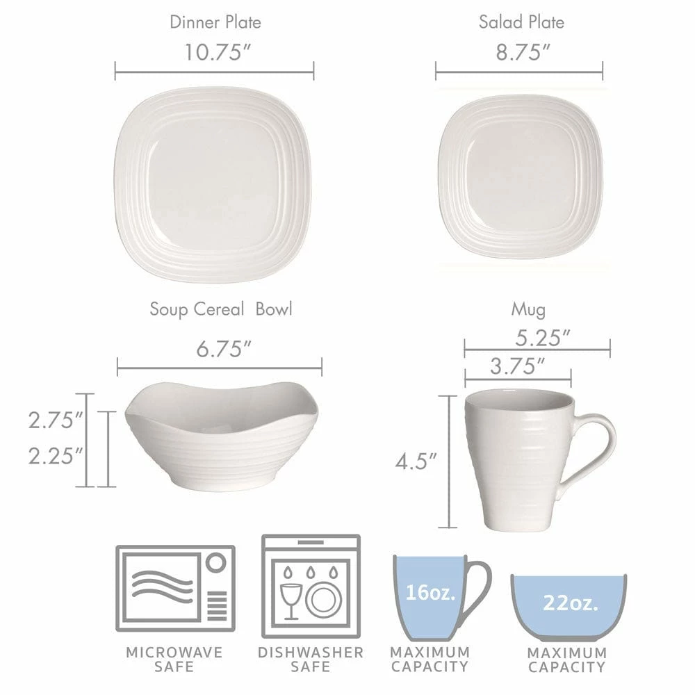 Swirl White’s rich, double finish – smooth and glossy on the inside, ribbed and matte on the outside – sets a striking and original tablescape. Crafted of ironstone with a pin-firing technique which allows the entire bottom of the plate to be glazed, including the base. This process significantly reduces water absorption and increases chip resistance. 4 piece place setting includes a 10-3/4 inch square dinner plate, 8-3/4 inch square salad plate, 24 ounce square cereal bowl and 18 ounce square mug. Microwave and dishwasher safe.