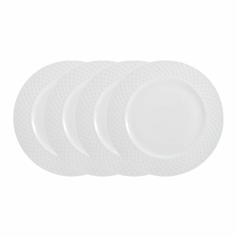 This Mikasa Trellis White Set of 4 Dinner Plates feature a contemporary, criss-cross line design framing the rim, creating eye-catching depth and movement on your tabletop.